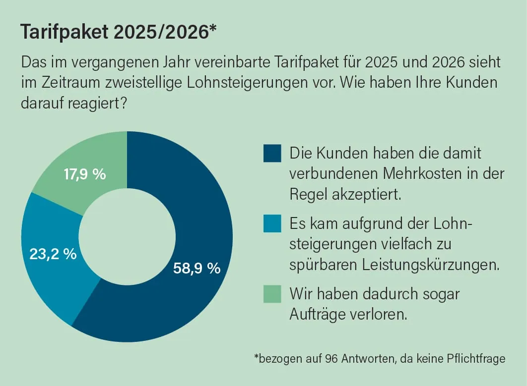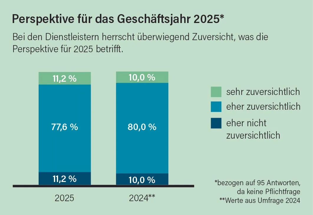 Eine zentrale Frage im Rahmen der breit angelegten Umfrage lautet stets, wie die Betriebe wirtschaftlich durch das zurückliegende Geschäftsjahr gekommen sind. Das Ergebnis: Im Durchschnitt konnten die Dienstleister ihren Umsatz im Jahr 2024 um 6,8 Prozent steigern. Damit ist das Wachstum im Vergleich zu den Jahren davor (2023: 10,7 Prozent; 2022: neun Prozent) zwar niedriger ausgefallen, aber durchaus noch mehr als respektabel angesichts der volatilen konjunkturellen Rahmenbedingungen und zunehmenden Herausforderungen, denen sich die Branche Tag für Tag stellen muss.