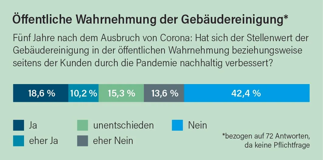 Angesichts der stetig sinkenden Lehrlingszahlen drängt sich die Frage auf, ob die Ausbildung zum Gebäudereiniger noch eine Zukunft hat. Ein Großteil der Umfrageteilnehmer antwortete darauf eindeutig mit "Ja". Dazu eine Stimme aus dem Teilnehmerkreis: "In einer Zeit, in der Materialien und Oberflächen immer vielfältiger werden und Reinigungschemikalien gezielt und verantwortungsvoll eingesetzt werden müssen, sind fundierte Fachkenntnisse unerlässlich. Eine qualifizierte Ausbildung vermittelt genau dieses Wissen und sichert die Qualität und Nachhaltigkeit unserer Arbeit – sie ist damit wichtiger denn je!" Ein anderer Unternehmensvertreter ergänzt: "Wichtig ist, den jungen Menschen bereits während der Ausbildung die aktuellen Entwicklungen in den Bereichen Digitalisierung und Robotik in der Gebäudereinigung nahezubringen. Das erhöht nicht nur die Attraktivität des Ausbildungsberufs, sondern zeigt den jungen Menschen auch die zukunftssicheren Aussichten in der Branche auf."