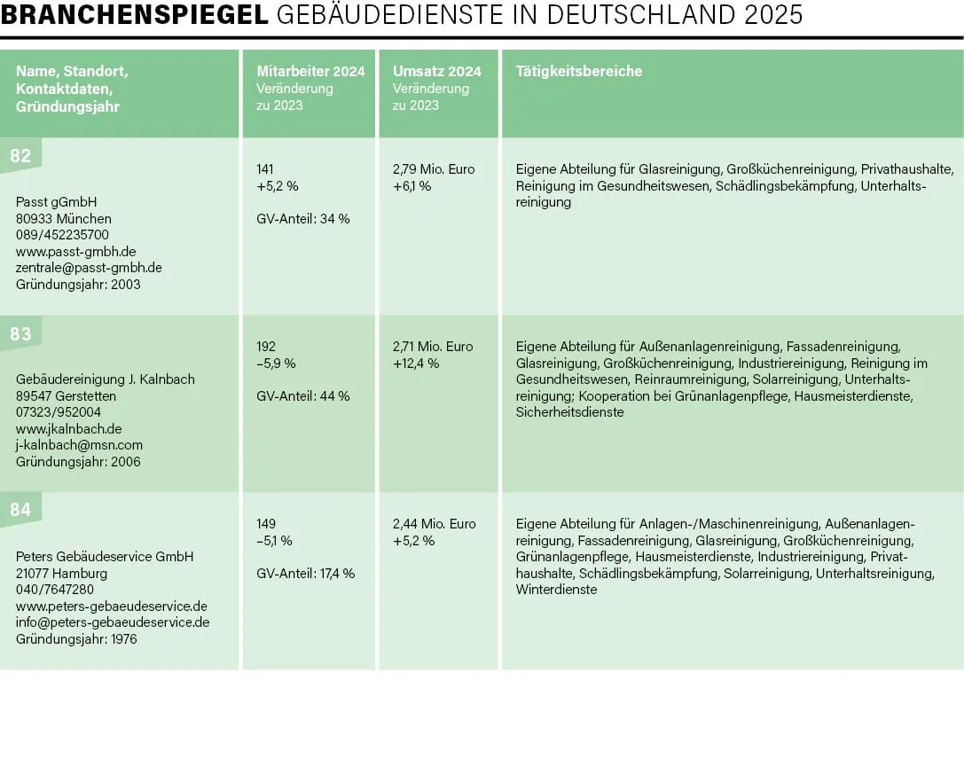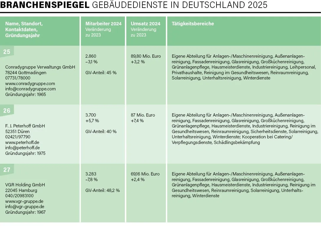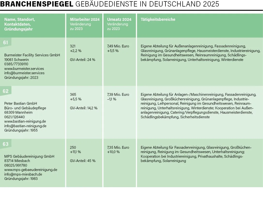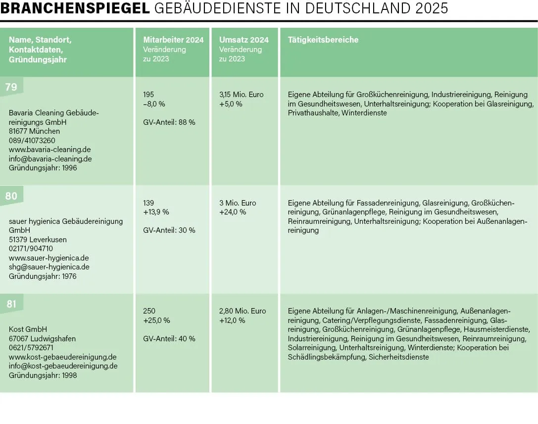Exakt 100 Unternehmen – vom Acht-Mann-Betrieb bis hin zu Konzernen mit mehreren Zehntausend Beschäftigten und Umsätzen im Milliarden-Euro-Bereich – haben sich in diesem Jahr an der traditionellen Umfrage von rationell reinigen im Zeitraum Mai/Juni beteiligt, drei Viertel davon nahmen bereits 2024 an der Befragung teil. Mit der Erhebung und Auswertung der Daten für die mittlerweile 31. Auflage des Branchenspiegels war wie auch in den Vorjahren die studentische Unternehmensberatung der Universität Augsburg, die JMS Augsburg e. V., beauftragt. Deren Erkenntnisse lieferten uns einmal mehr die Basis, um ein aktuelles Lagebild der Branche zu erstellen.