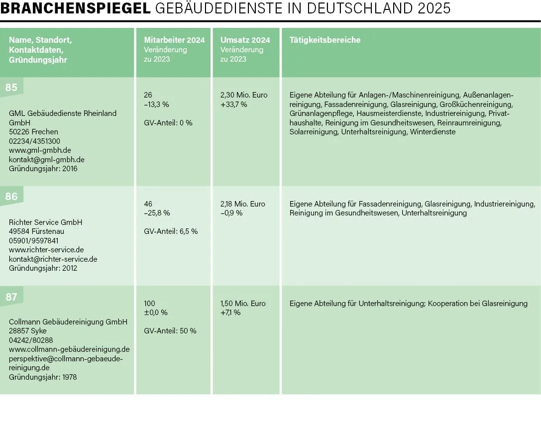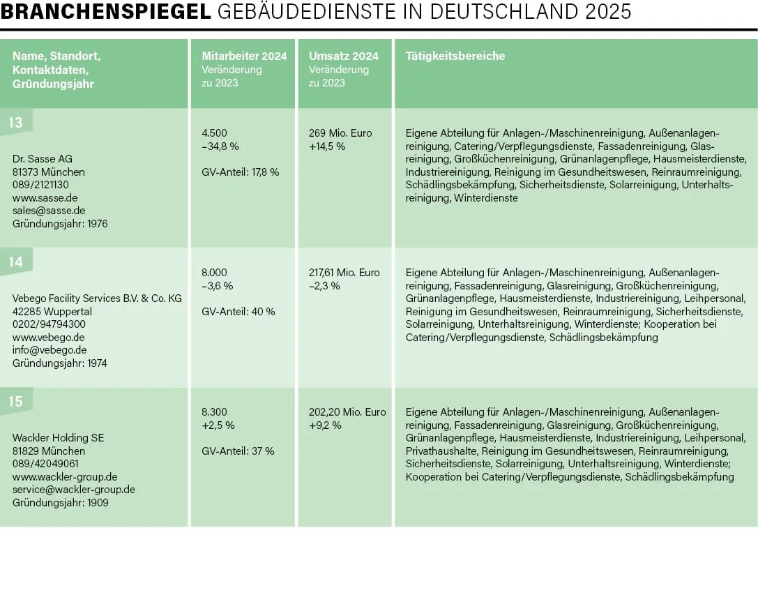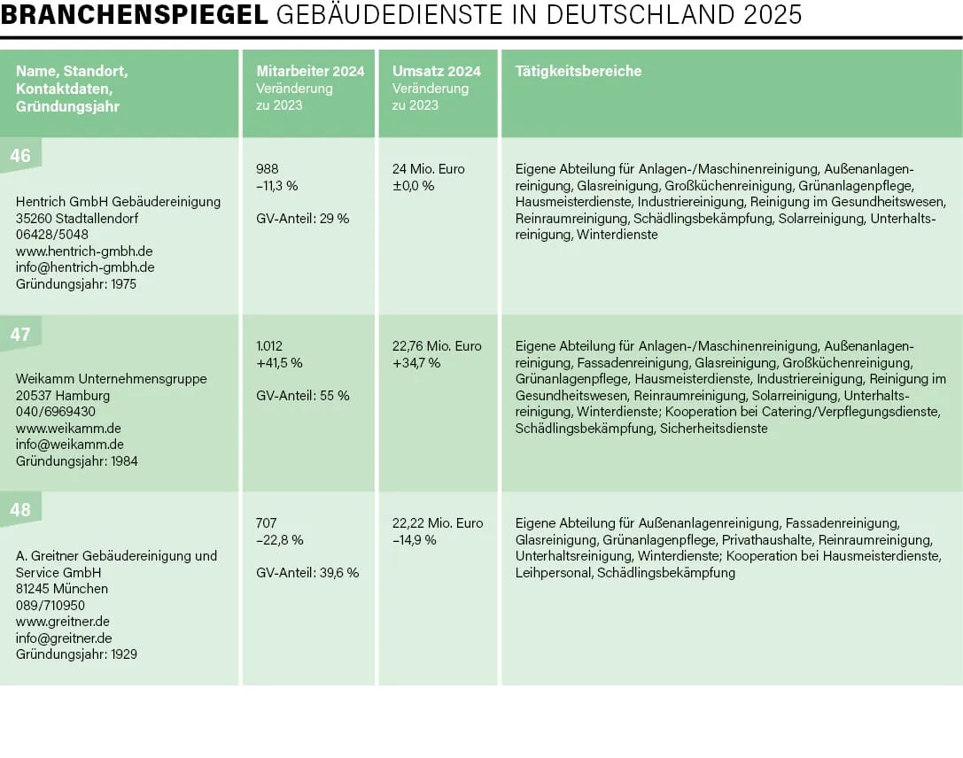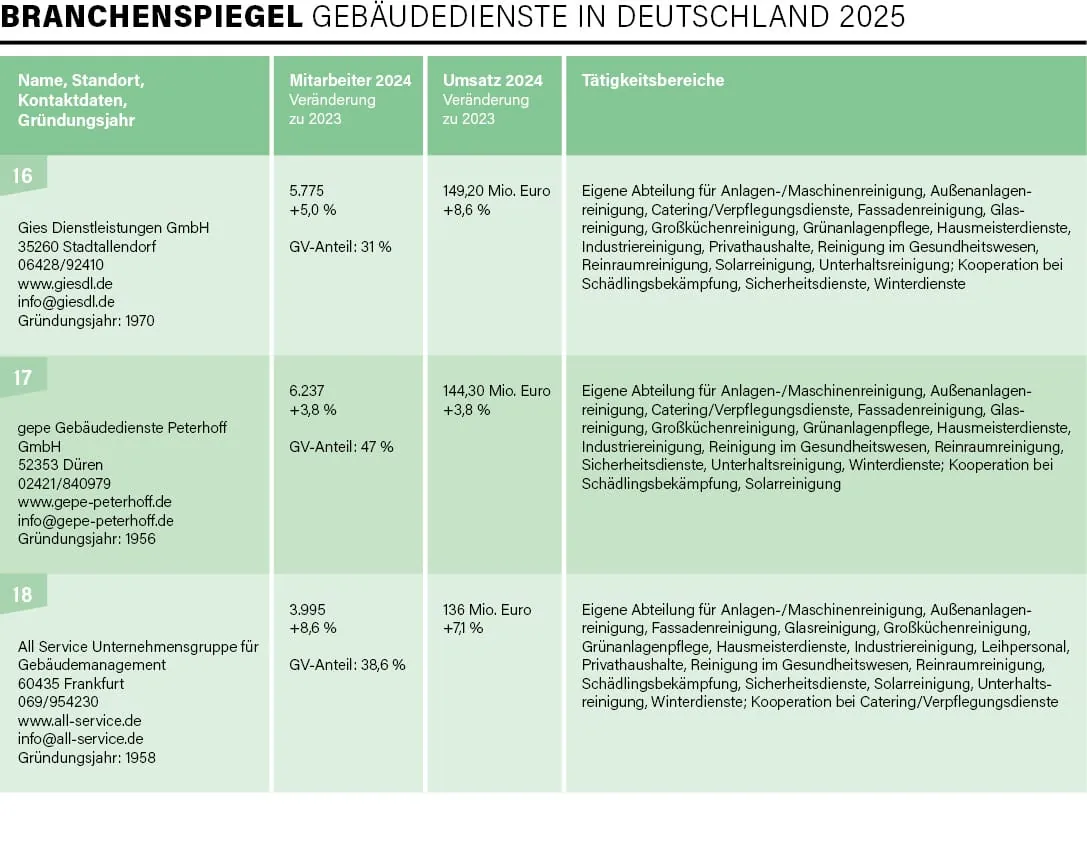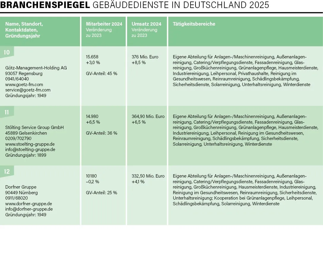Exakt 100 Unternehmen – vom Acht-Mann-Betrieb bis hin zu Konzernen mit mehreren Zehntausend Beschäftigten und Umsätzen im Milliarden-Euro-Bereich – haben sich in diesem Jahr an der traditionellen Umfrage von rationell reinigen im Zeitraum Mai/Juni beteiligt, drei Viertel davon nahmen bereits 2024 an der Befragung teil. Mit der Erhebung und Auswertung der Daten für die mittlerweile 31. Auflage des Branchenspiegels war wie auch in den Vorjahren die studentische Unternehmensberatung der Universität Augsburg, die JMS Augsburg e. V., beauftragt. Deren Erkenntnisse lieferten uns einmal mehr die Basis, um ein aktuelles Lagebild der Branche zu erstellen.