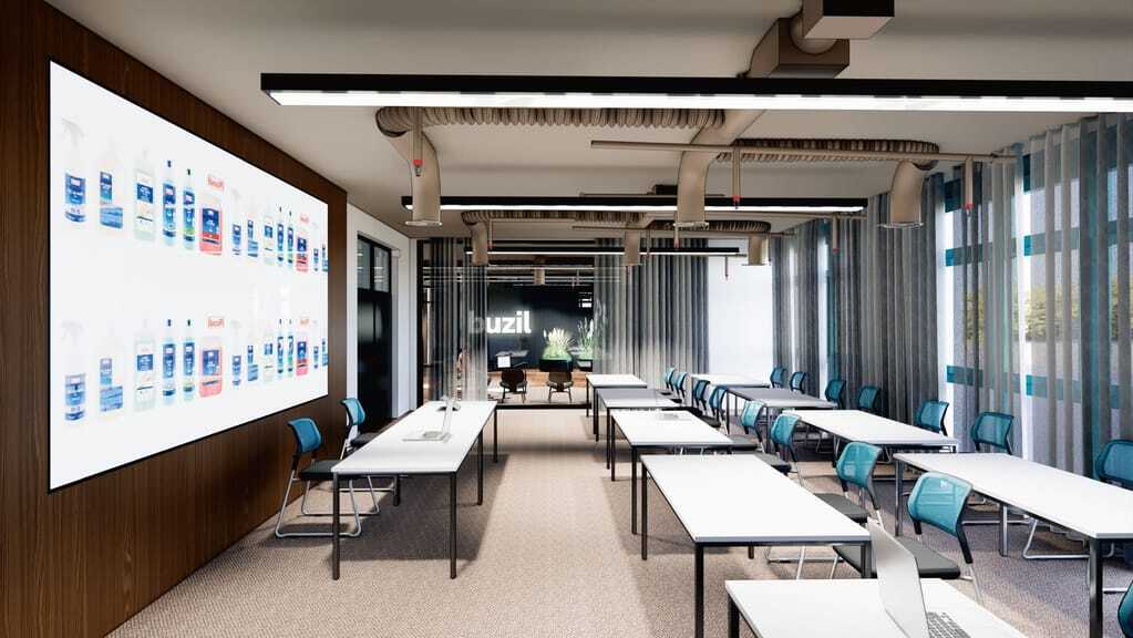 Der bisherige Schulungsraum – 70 Quadratmeter groß – war der großen Nachfrage nach Seminaren nicht mehr gerecht geworden. Die neue Buzil-Academy wurde in acht Monaten Bauzeit errichtet. Sie bietet auf rund 500 Quadratmetern Fläche sieben Themengondeln und mehr als 15 unterschiedliche Bodenbeläge für praktische Anwendungen. Zur Ausstattung gehören eine große LED-Videowand im Schulungsraum sowie Teams-Room-Technologie in allen Bereichen.