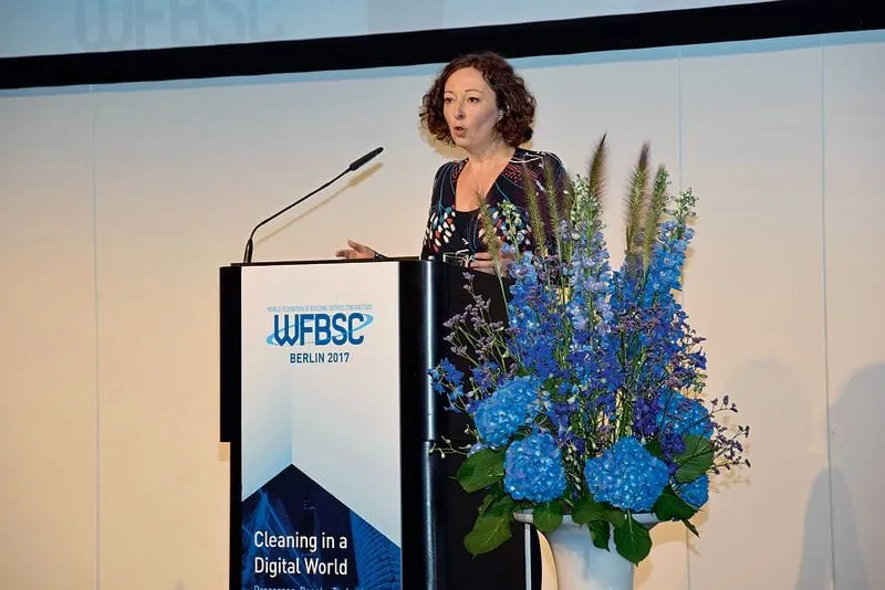 Am zweiten Kongresstag informierte Dr. Ilham Kadri, Präsidentin von Diversey, zunächst über die Planungen für die neue Struktur des WFBSC. Der WFBSC solle fortan zukunftsorientierter und stärker an den Bedürfnissen der Mitglieder orientiert arbeiten. Auch Vertreter von Zulieferern der Branche sollen aufgenommen werden. Daneben verabschiede man sich von der Regelung, dass automatisch ein Mitglied des kongressausrichtenden Landesverbandes die WFBSC-Präsidentschaft übernimmt. Im Juni 2018, so Dr. Kadri, soll die Struktur stehen. Bei ihrem anschließenden Vortrag stellte sie fest, dass die Digitalisierung in der Reinigungsbranche bereits stark fortgeschritten sei. Bis 2020, so ihre Vorhersage, werden die 800 Millionen in der Reinigungsbranche tätigen Menschen durch 26 Millionen Geräte mit unzähligen Sensoren verbunden sein, die u. a. den Verschmutzungsgrad von Gebäuden messen. Da derzeit noch etwa 70 % des Reinigungspersonals weltweit nicht lesen und schreiben könnten, müsse die Bedienung der Geräte so einfach wie möglich (etwa durch Piktogramme) gestaltet werden. Gleichzeitig, so Dr. Ilham Kadri, sei eine bessere Bildung für die Beschäftigten auf dem Weg in die Digitalisierung unerlässlich. Die Digitalisierung der Reinigungsbranche sei zudem der einzige Weg, weniger Ressourcen (z. B. Energie, Wasser) zu verbrauchen, die Umwelt zu schonen und gleichzeitig profitabler zu arbeiten. Die Menschen würden in der Reinigungsbranche zwar immer der wichtigste Faktor bleiben, doch auch selbstlernende Roboter und damit die künstliche Intelligenz würden nach und nach Einzug halten.