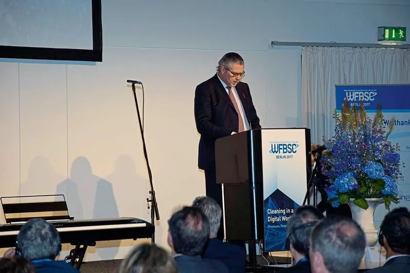 In seiner Eröffnungsrede unterstrich Thomas Dietrich, WFBSC-Präsident und Bundesinnungsmeister des Bundesinnungsverbands des Gebäudereiniger-Handwerks (BIV), dass die Prozesse, die Menschen und die Technik die entscheidenden Gestaltungsfaktoren bei der Digitalisierung seien. Er prophezeite den Anwesenden, dass die Digitalisierung die Geschäftsgrundlage aller Anwesenden verändern werde.