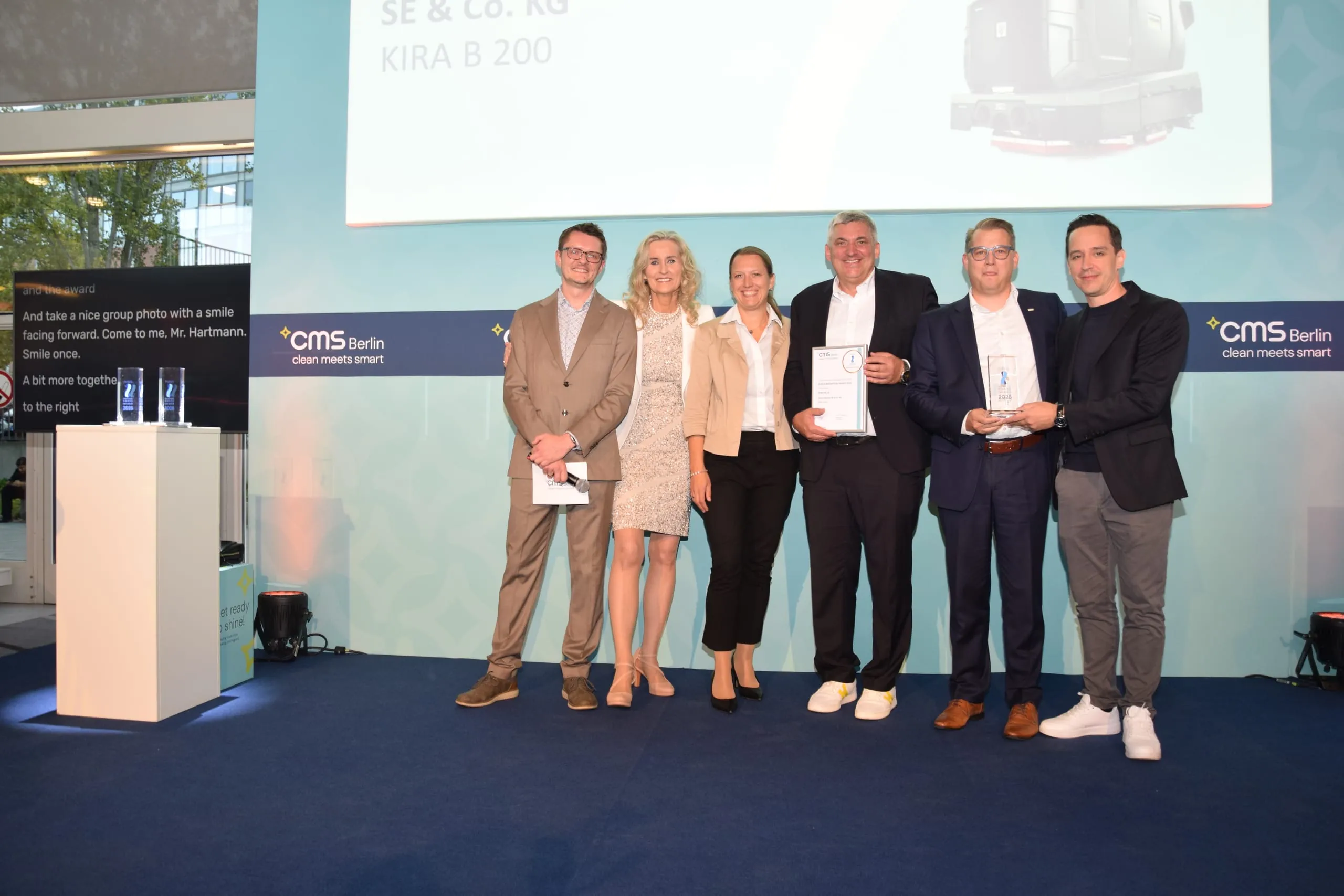 In der Kategorie Robotik/KI wurde der Reinigungsroboter Kira B 200 von Kärcher ausgezeichnet. Jury-Mitglied Sascha Hartmann (li.) übergab den Preis an Bettina Biebl, Dr. Frank Fuchs, Dr. Frank Jacob und Dr. Felipe Garcia Lopez (v.li.).