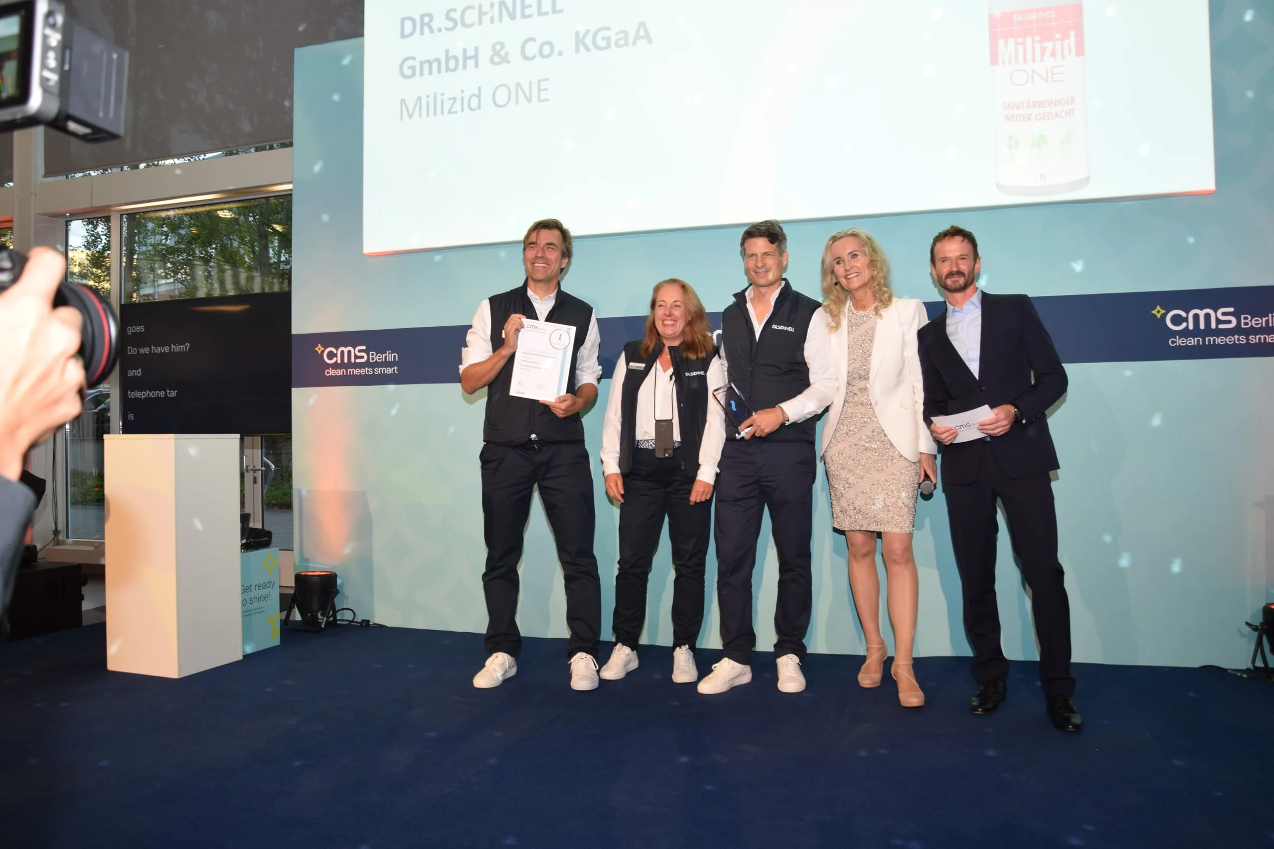 In der Kategorie Reinigungsmittel setzte sich der Sanitärreiniger Milizid One von Dr. Schnell durch. Entgegen nahmen den Preis Dr. Axel Schlossbauer, Leiter Produktsysteme, Marion Lechner, Produktmanagerin Gebäudereinigung, und Dr. Thomas Schnell (v.li.), hier zu sehen mit Moderatorin Ulrike Winzer und Jury-Mitglied Prof. Dr. Benjamin Eilts.