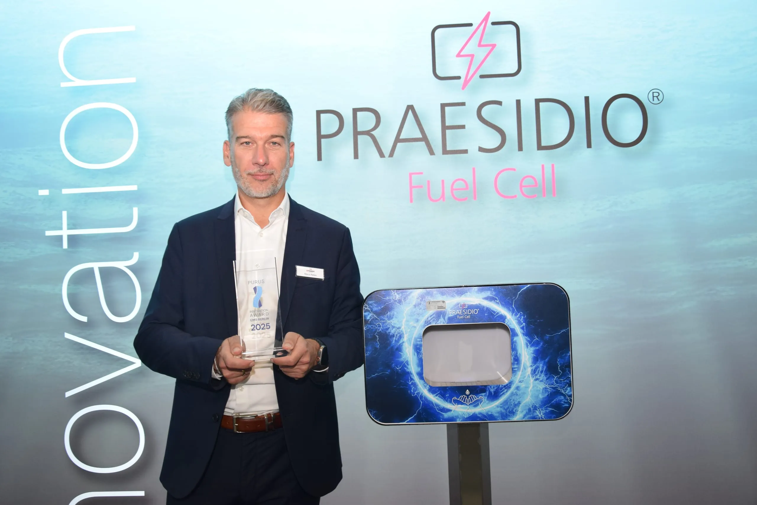 Der Spender, hier präsentiert von Marco Peelen, Bereichsleiter Vertrieb Europa und APAC, wird von einer integrierten Brennstoffzelle angetrieben.