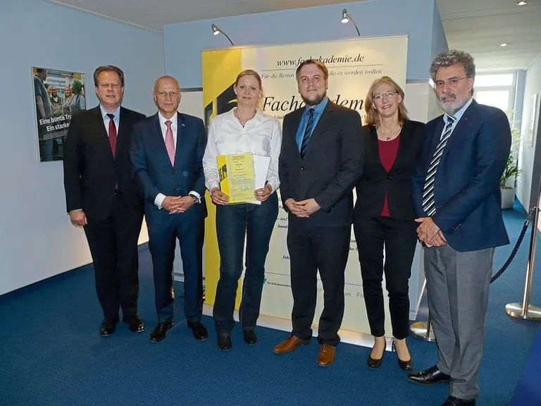Cordula Lau (3.v.li.) wurde als beste Teilnehmerin des Objektleiterlehrgangs in Köln ausgezeichnet. Mit ihr freuen sich (v.li.) Referent Gerald Flor, Frank Ackermann (geschäftsführender Direktor, Kötter), Tim Wieser, Leiter der Kötter-Niederlassung Dortmund, Lehrgangsleiterin Ilka Geske-Schumann und Bernhard Nordhausen, Geschäftsführer des Landesinnungsverbandes NRW. Bild: Innung - © Innung