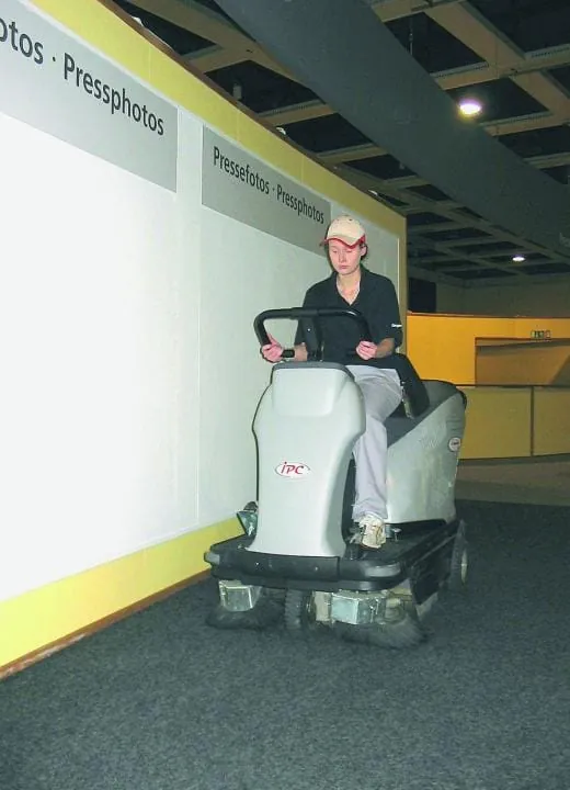 Damit sich pünktlich zum jeweiligen Veranstaltungsbeginn die Ausstellungsfläche optisch in einem sauberen Zustand präsentiert, kommt der Reinigungstechnik eine große Bedeutung zu. Zum gründlichen und wirtschaftlichen Kehren der Teppichfliesen und Auslegware in den Hallen setzt das Dienstleistungsunternehmen drei Kehrsaugmaschinen der IP Gansow GmbH, Hamm, ein: die handgeführten Maschinen Jet 460 B und Jet 520 BT sowie die speziell fürs Teppichkehrsaugen umgebaute Aufsitzmaschine Genius 1050 DP. Sie erlauben hohe Flächenleistungen und sind damit für eine wirtschaftliche Reinigung prädestiniert. Die Abkürzung DP steht übrigens für Dual Power: Der Hybridantrieb gestattet das Umschalten vom Verbrennungsmotor auf den Batterieantrieb. Die Folgen sind unter anderem eine höhere Leistung um bis zu 20 Prozent, weniger Spritverbrauch und damit eine geringere Umweltverschmutzung.