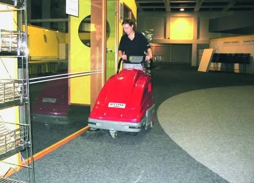 Auf den weniger empfindlichen textilen Belägen, den Teppichfliesen, kommt die robuste Aufsitzmaschine zum Einsatz. Ausgestattet mit Benzin- und Batterieantrieb sowie umgebaut mit Flaps, Rädern und Kehrwalze speziell für die Teppichreinigung sorgt sie für eine besonders hohe Flächenleistung. Sie liegt bei 6.600 m2/h.
