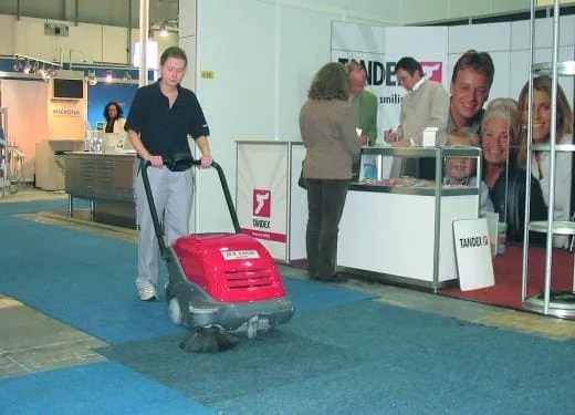 Messehallen Berlin: Vor und während einer Messe laufen drei Kehrsaugmaschinen zu großer Form auf. Auf den Gängen und Ständen kehren sie problemlos die qualitativ unterschiedliche Auslegware und beseitigen den hohen Schmutzanfall.