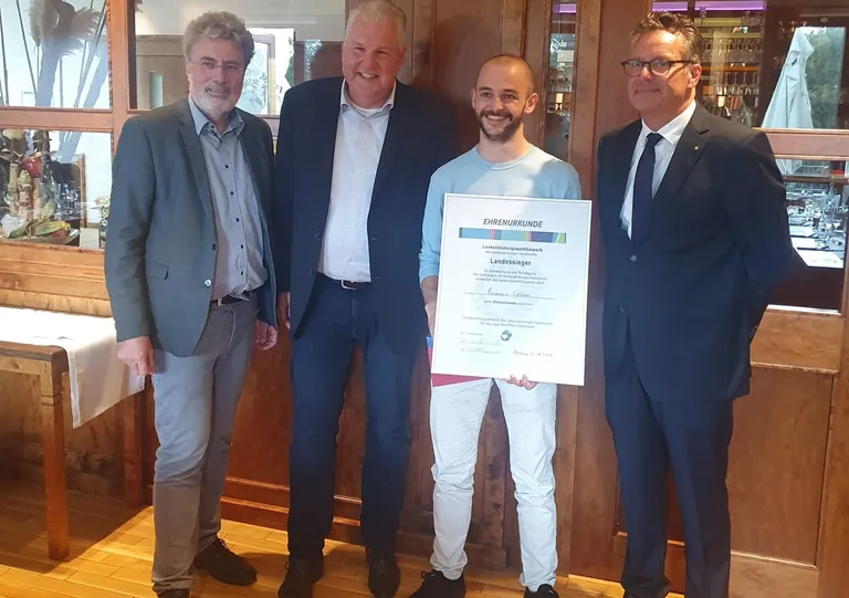 Domenic Löhrer (2.v.re.) wurde als Landessieger 2021 ausgezeichnet. Mit ihm freuen sich (v.li.) Bernhard Nordhausen, Geschäftsführer des Landesinnungsverbandes NRW, Landeslehrlingswart Siegfried Ruhkamp und Jan Trompeter (Signal Iduna Hauptverwaltung), - © Innung