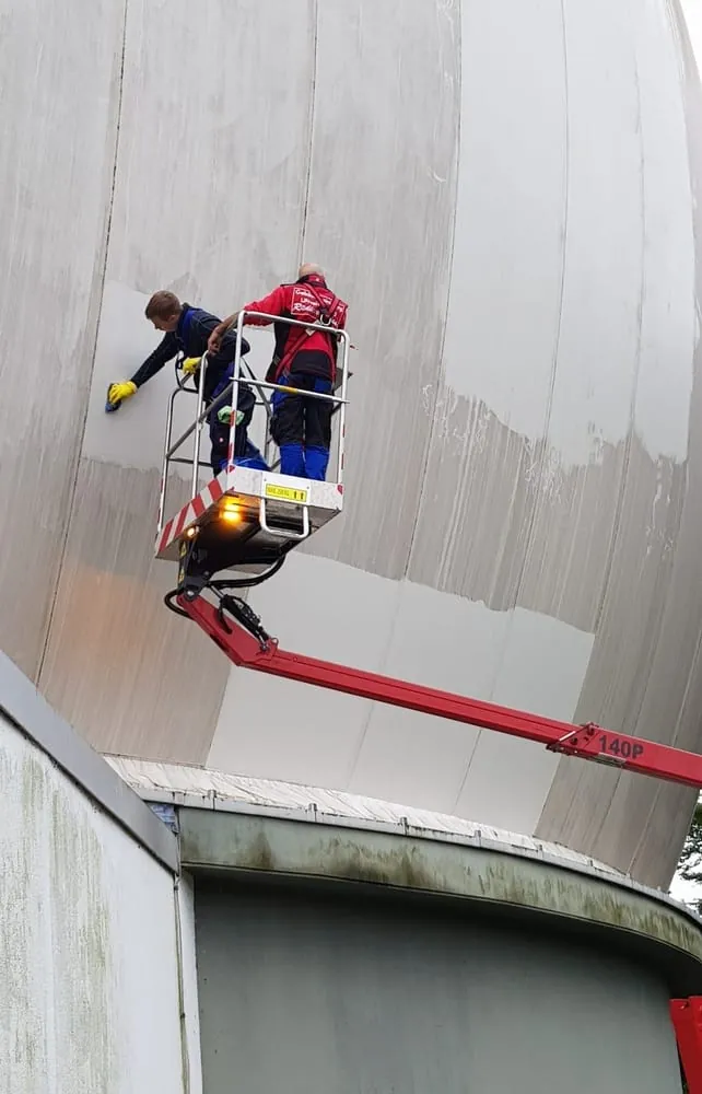 Auch die Außenhülle der Sternwarte musste gereinigt werden. Dabei kam ein Teleskopsteiger zum Einsatz.