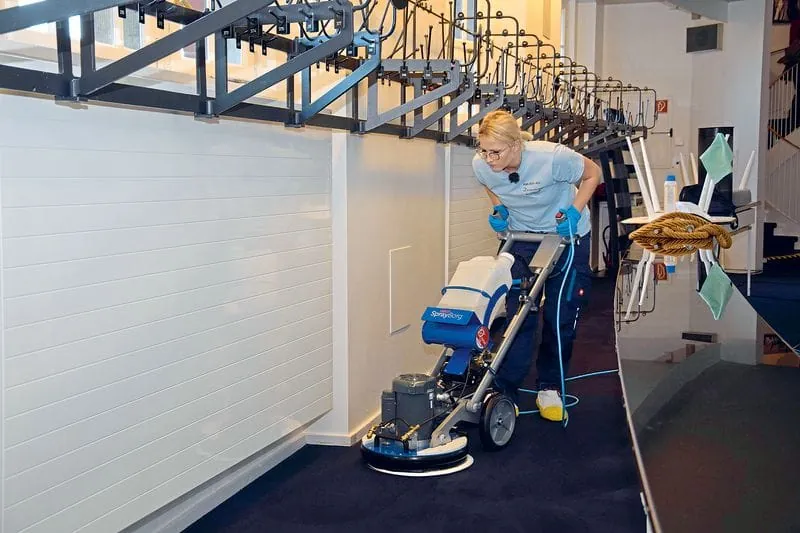 Im Garderobenbereich stand eine Zwischenreinigung des Teppichs auf dem Programm. Zum Einsatz kam eine oszillierend arbeitende Orbitalmaschine mit speziellen Pads.