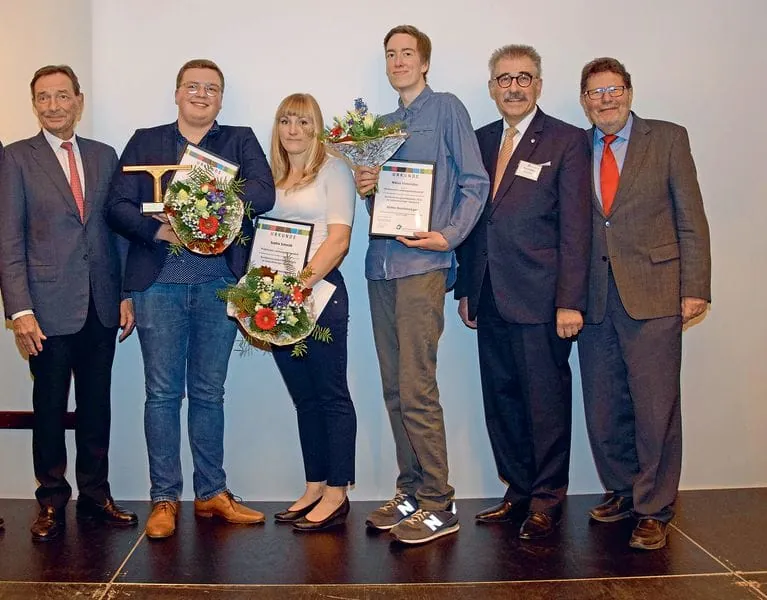 Julian May (2.v.li.) setzte sich beim Bundesleistungswettbewerb 2019 als Sieger durch – hier zu sehen mit Sophie Schmidt (Platz zwei) und Niklas Klinkmüller (Platz drei) sowie Dieter Kuhnert (li.), Roland Böhm und Wilfried Birck (v.li.).