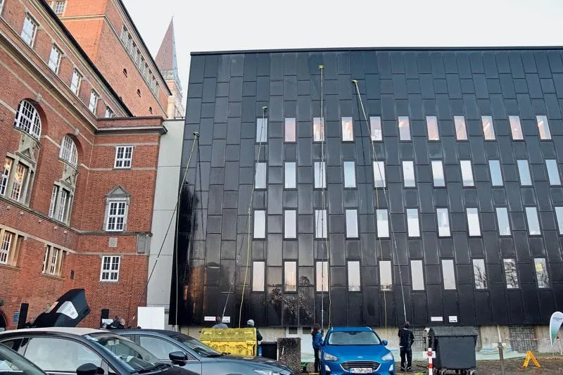 Zu reinigen war die Glasfassade eines Anbaus aus neuer Zeit - mit entmineralisiertem Wasser und einem 20 Meter langen Stangensystem.
