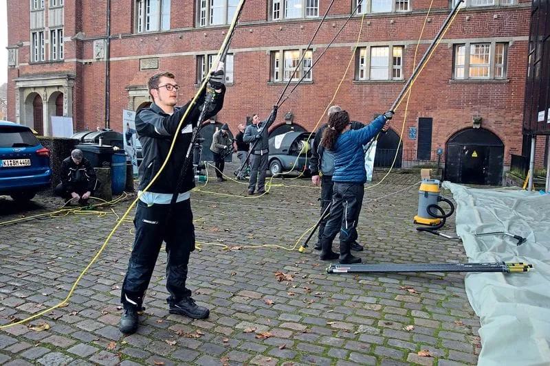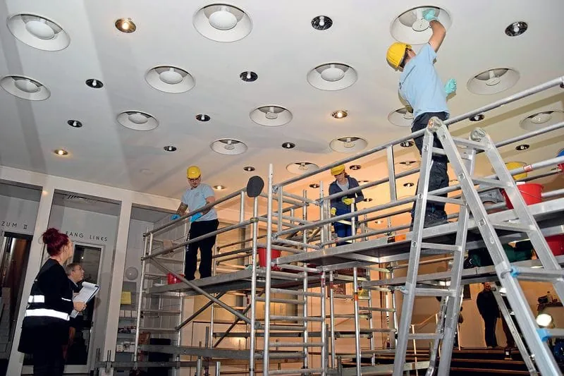 Im Foyer des Kieler Opernhauses ging es um die Reinigung der Deckenlampen – jeweils vier pro Wettbewerbsteilnehmer. Gearbeitet wurde auf Rollgerüsten.