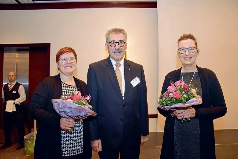 Für 25-jährige Tätigkeit in der Jury des Bundesleistungswettbewerbs geehrt: Michaela Peters (li.) und Susanne Selbrede. BIV-Vorstandsmitglied Roland Böhm überreichte Blumen.