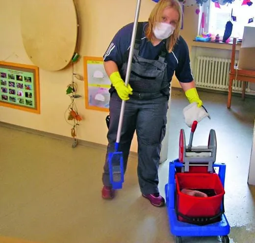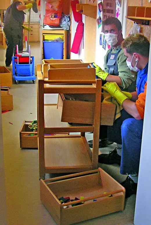 Das Geschirr der Kinder wurde in der Spülmaschine mit alkalischen Tabs im heißesten Programm für Töpfe und Pfannen gereinigt. „Ich habe mir zunächst Gedanken gemacht, wie wir die Teller am besten desinfizieren, dann ist mir eingefallen, dass alkalische Spülmittel natürlich eine desinfizierende Wirkung haben“, erklärt Dornbrach. Die Sanitäranlagen wurden regelrecht gebadet, denn Noroviren werden oft auf Toiletten über den Kontakt mit Ausscheidungen infizierter Personen übertragen. Der Ausbilder wies die Mannschaft an, sämtliche Einrichtungsgegenstände und Wände mit der desinfizierenden Lösung nass abzuwaschen und anschließend mit einem ausgewrungenen Desinfektionslappen nochmals abzuwischen. Die Schränke der Tagesstätte rückten die Azubis von den Wänden und wischten sie außen und innen gründlich mit Desinfektionslappen aus. Die Oberfläche der Stühle und Tische wurde auf dieselbe Weise bearbeitet. Für den Boden hatte die Truppe 40er-Mikrofaser-Breitwischbezüge mit Desinfektionswaschmittel gewaschen und für das Wischen eine desinfizierende Lösung angesetzt. Dornbrach: „Nach drei Räumen haben wir die Lösung gewechselt und sind mit dem Doppelfahrwagen weitergezogen.“ Drei Azubis durften zum ersten Mal seit Kindertagen wieder mit Bauklötzchen spielen, die es hier kistenweise gab. Jedes einzelne Holzklötzchen musste von Hand abgewaschen, abgetrocknet und aufgestapelt werden. Eine Fleißaufgabe, über die sich aber niemand beschwerte.