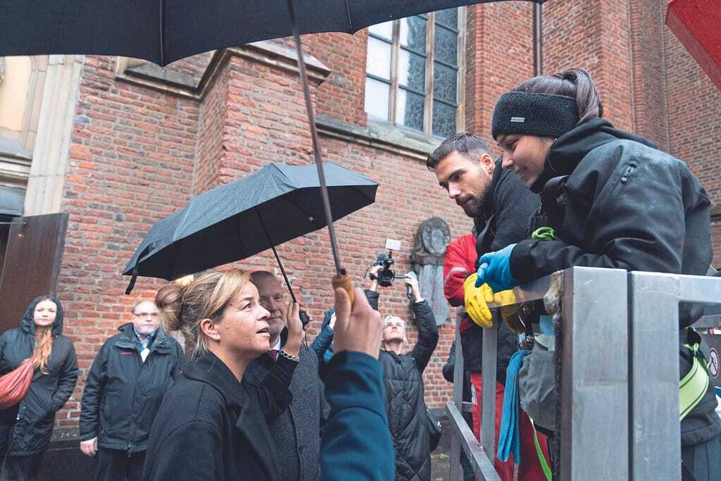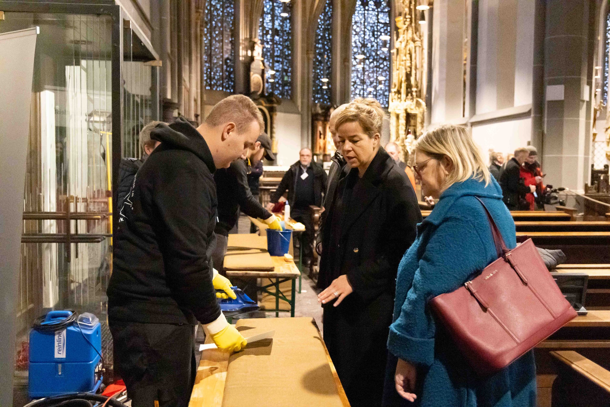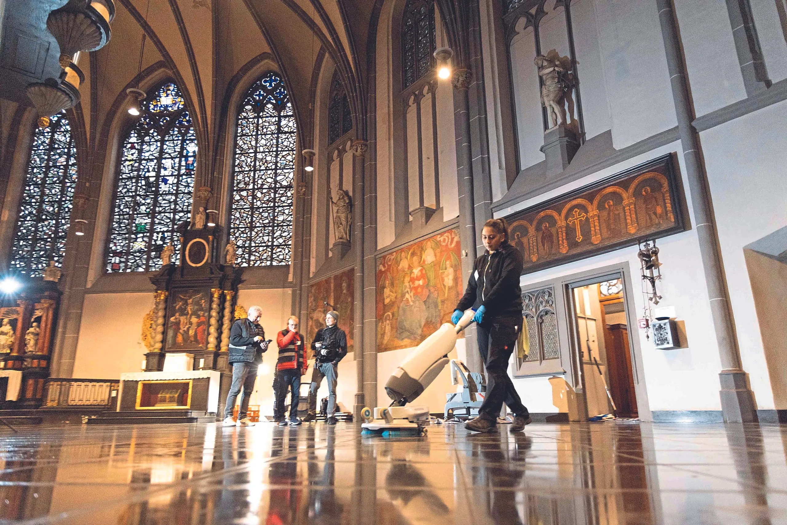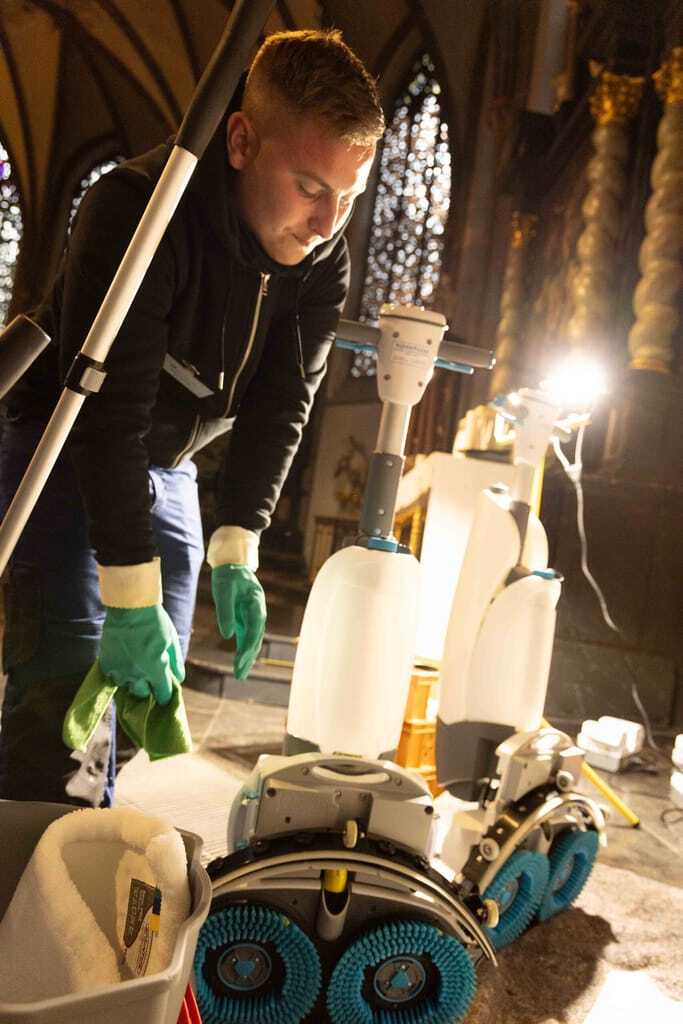 So konnte die Ministerin zum Beispiel mitverfolgen, wie der Kalksteinboden "Belgisch Blaustein" erst gesichert und dann mit einem Mopp vom Grobschmutz befreit wurde. Anschließend mussten die Teilnehmer ihre Kompetenz an einer handgeführten Scheuersaugmaschine mit kontra-rotierenden Bürsten unter Beweis stellen. Auflage der Kirche war es, den Natursteinboden ausschließlich mit Wasser zu reinigen. Die geplante Versiegelung des Bodens konnte deshalb nicht realisiert werden.