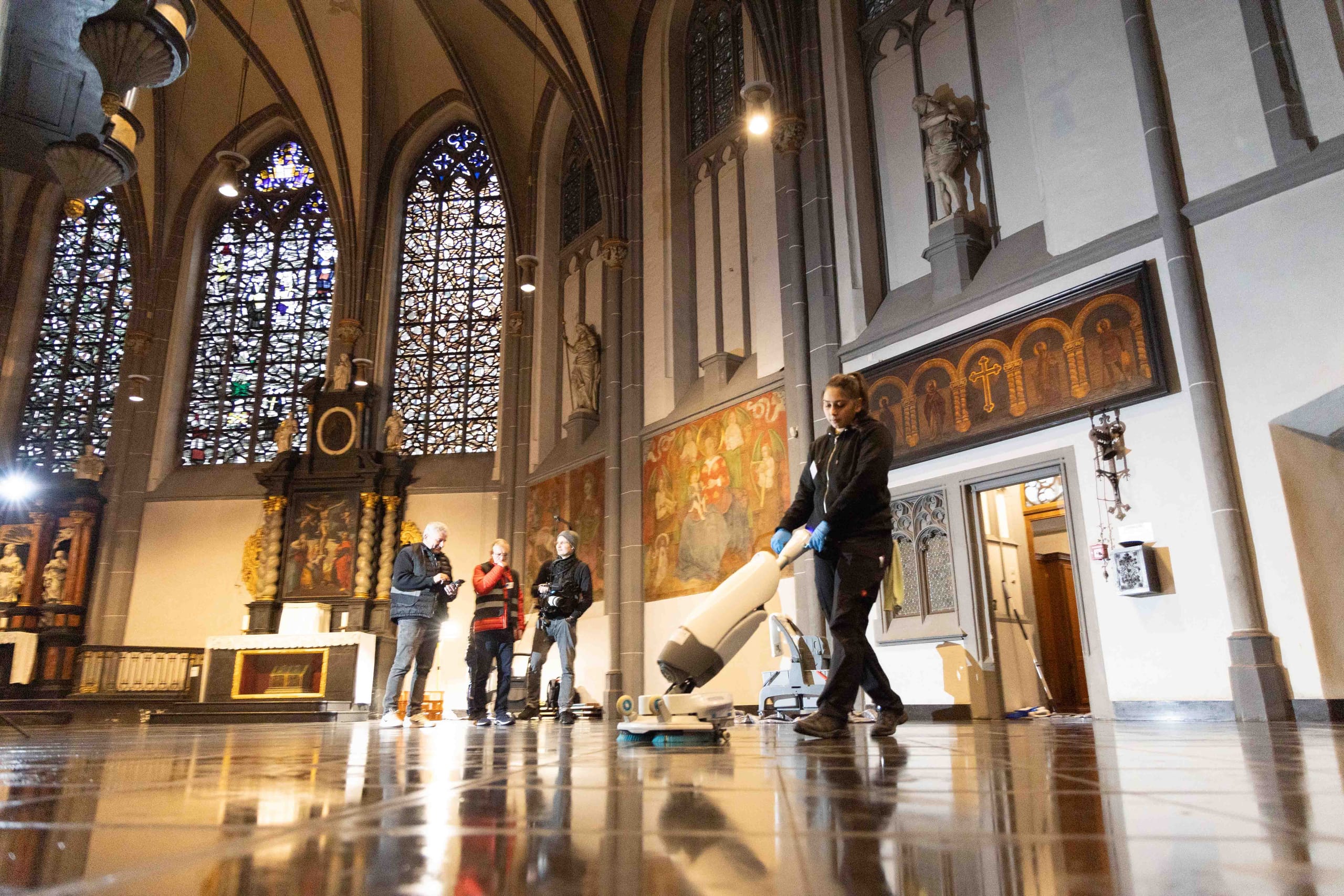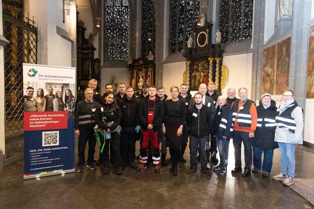 Morgens um acht ging es los in der Basilika St. Lambertus, die von den Einheimischen liebevoll "Lambätes" genannt wird. Sie gehört zu den vier römisch-katholischen Kirchen in der Düsseldorfer Altstadt und ist das wohl älteste Bauwerk und Wahrzeichen der historischen Kernstadt. Die Geschichte des Ortes und die Wurzeln des Gebäudes gehen bis ins 12. Jahrhundert zurück – eine große und interessante Herausforderung für Deutschlands beste Absolventen der Gebäudereinigerausbildung.