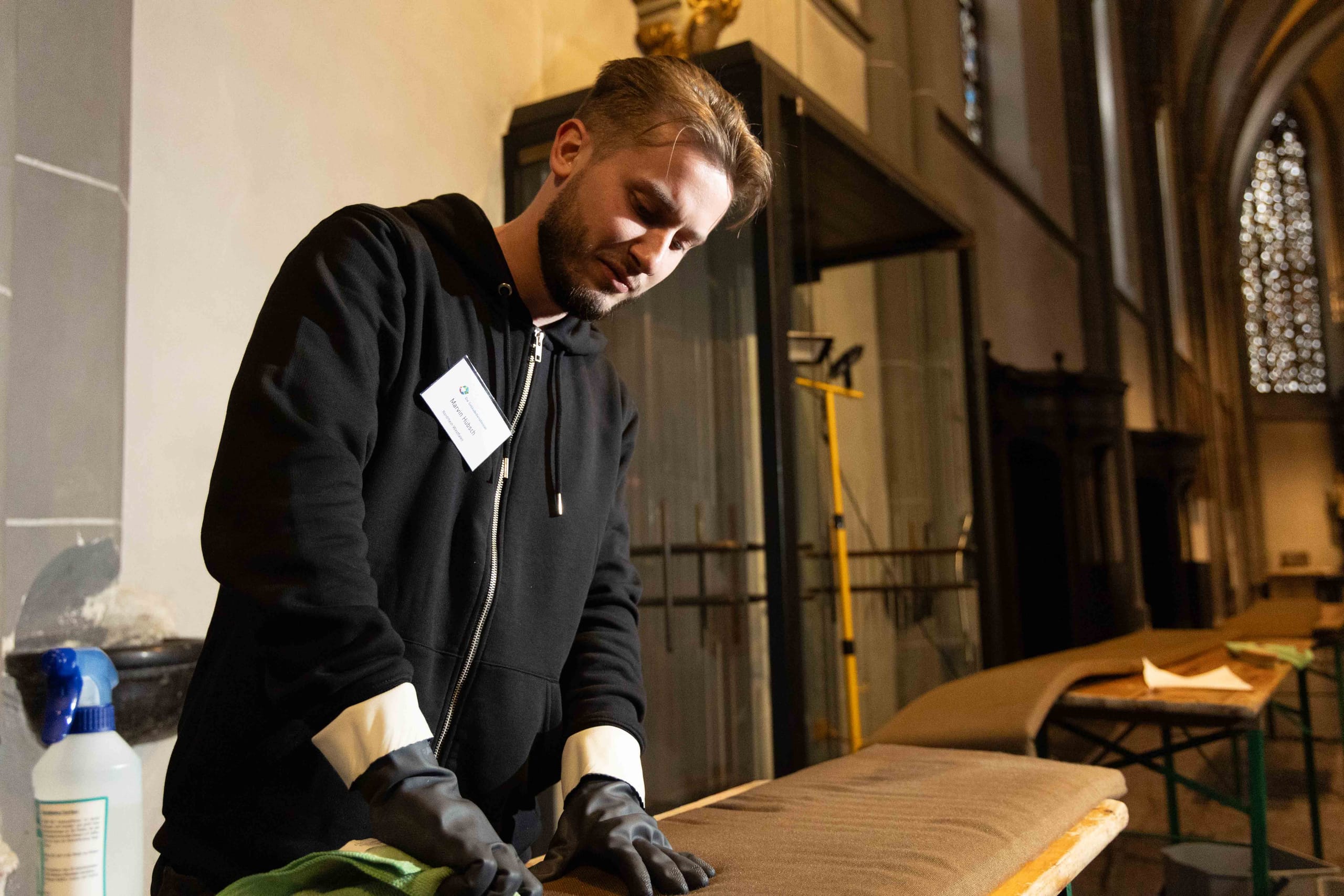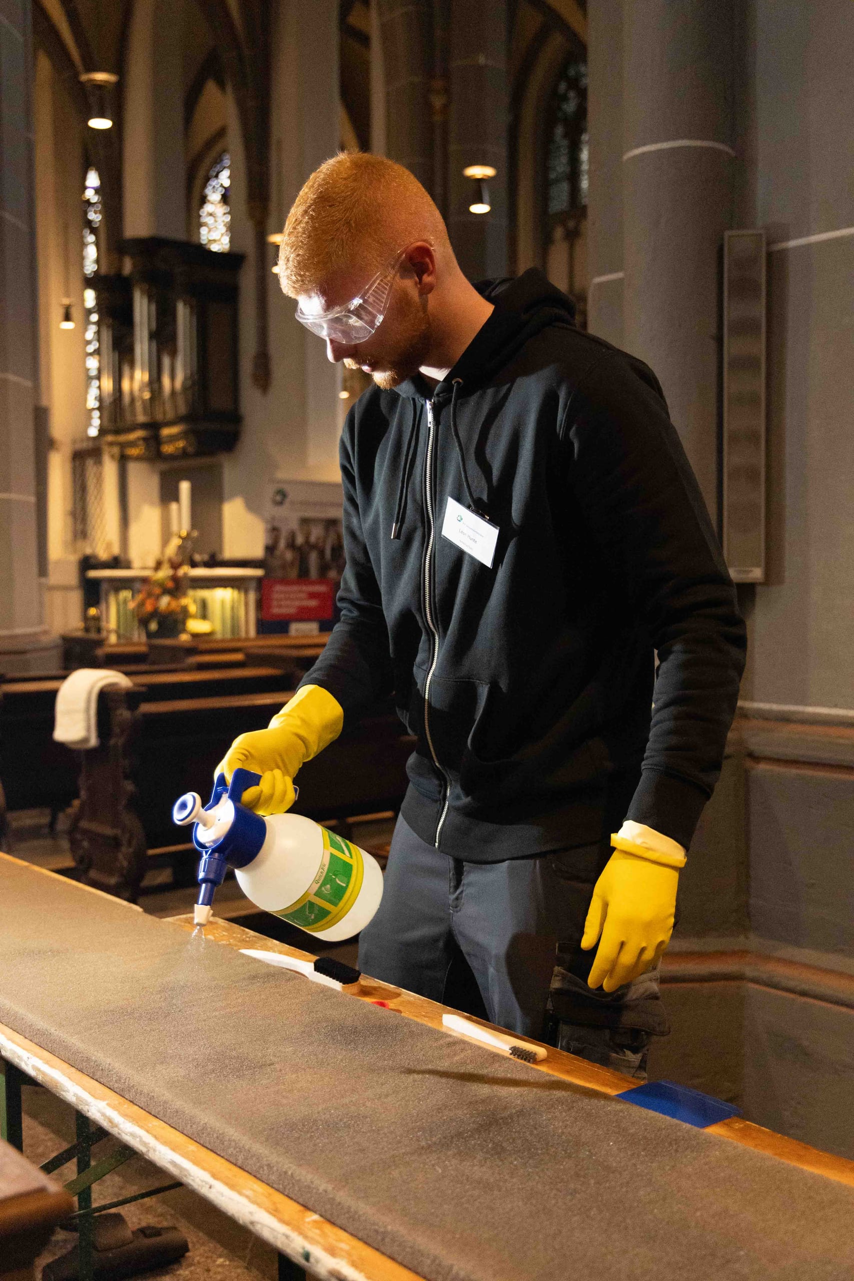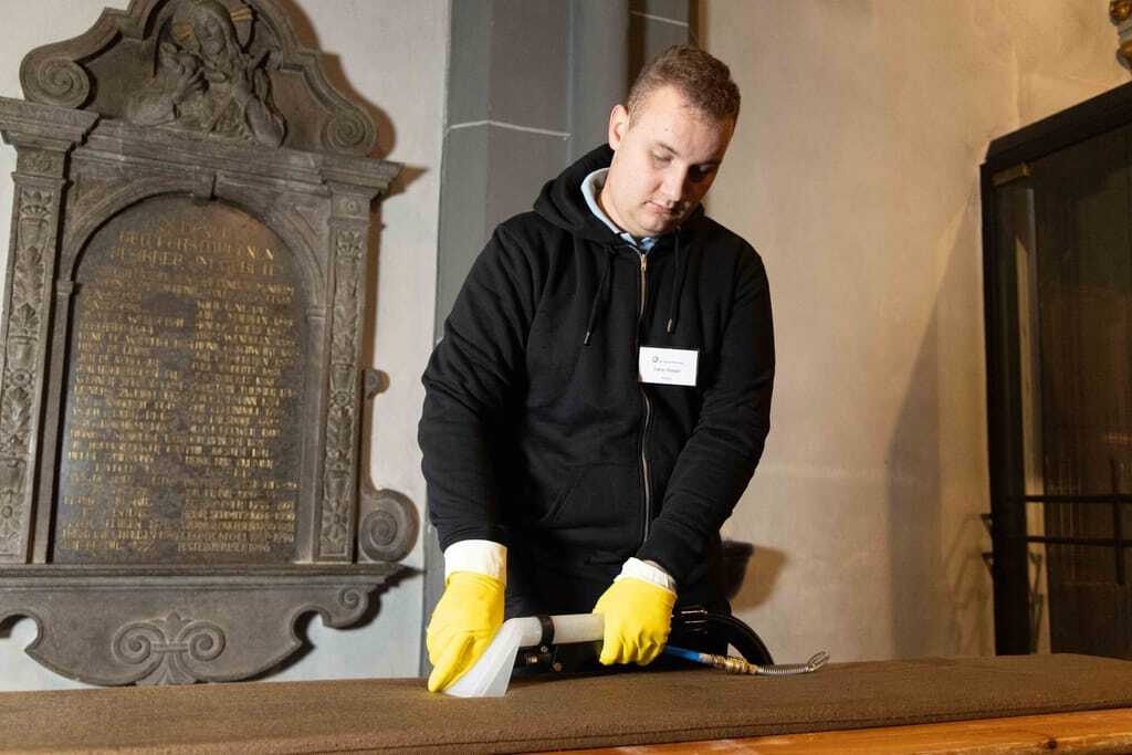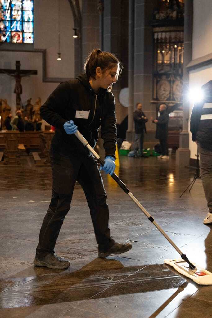 An den beiden Stationen im Inneren der Kirche ging es derweil um die textile Grundreinigung der Sitzpolster für die Kirchenbänke sowie um die Grundreinigung des Natursteinbodens. Bei der Polsterreinigung musste mit einem Sauger zuerst der Grobschmutz entfernt werden. Anschließend wurde vorhandenes Kerzenwachs mit Eisspray, Bügeleisen auf mittlerer Temperatur und Löschpapier und/oder Spachtel beseitigt. Bei der Detachur kamen tensidfreie Fleckenentferner und Sprühextraktionsgeräte mit klarem Wasser zum Einsatz.
