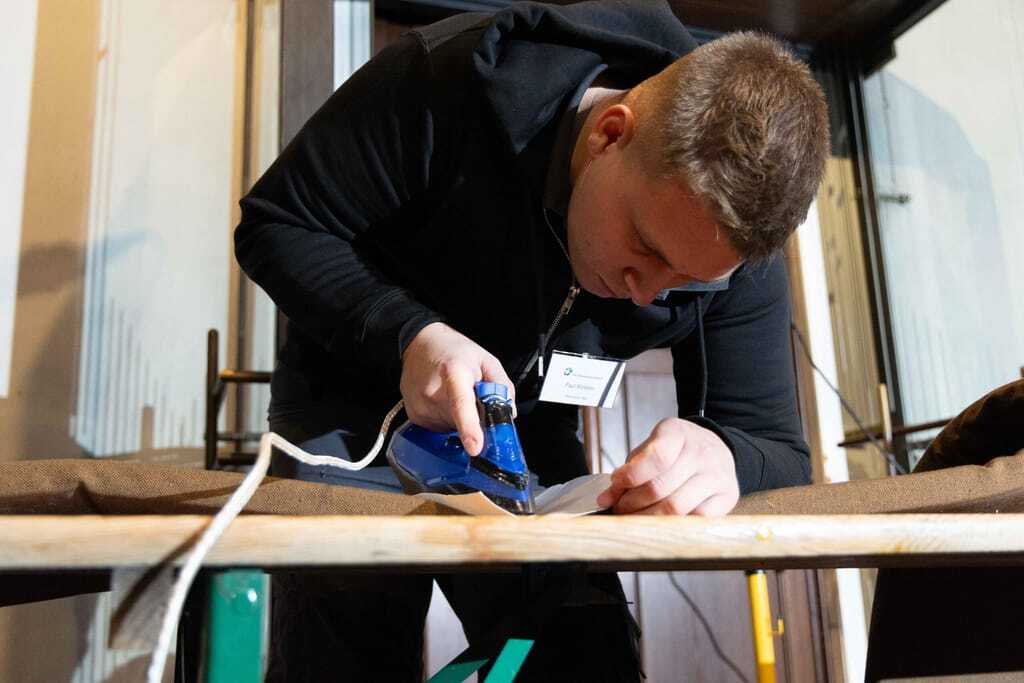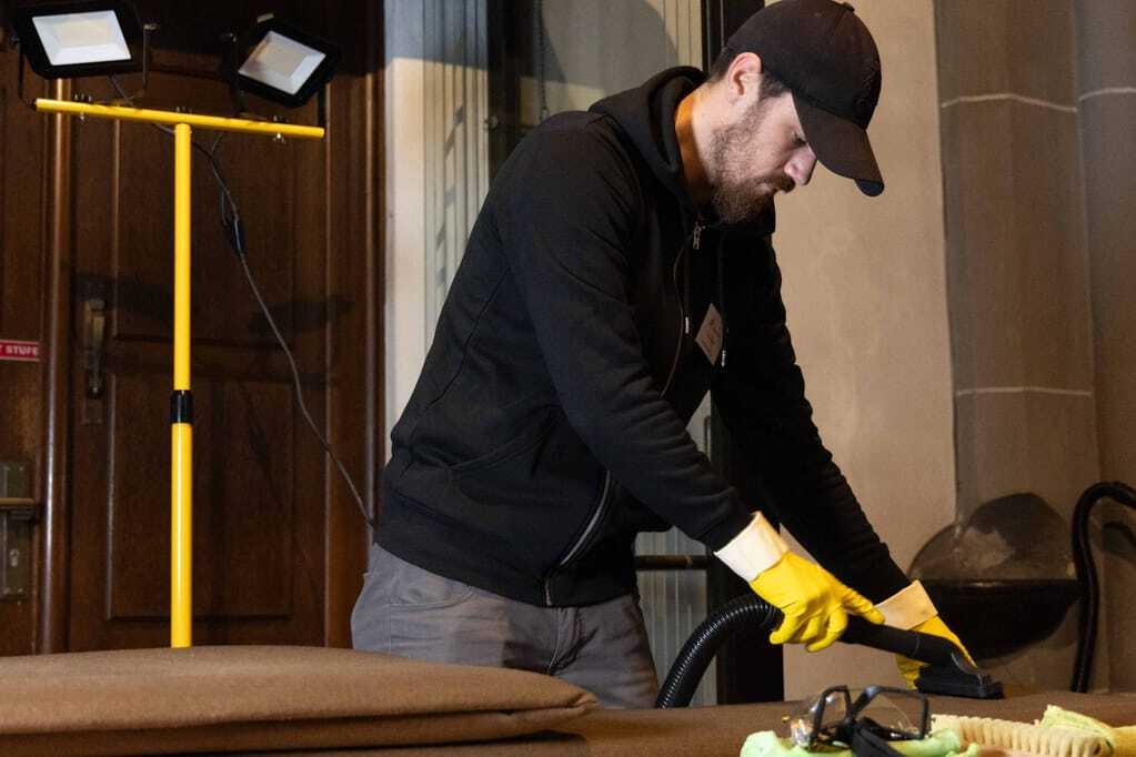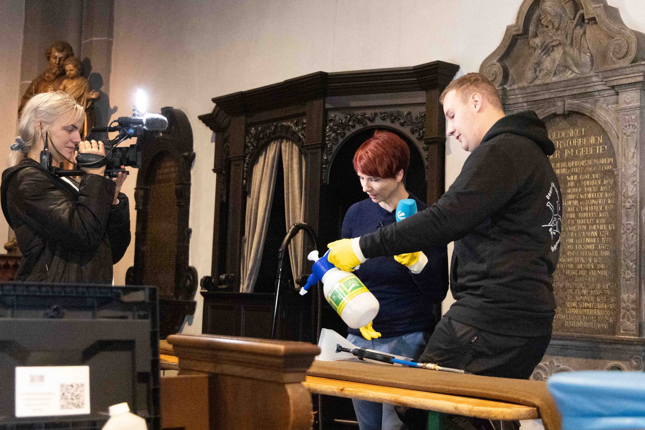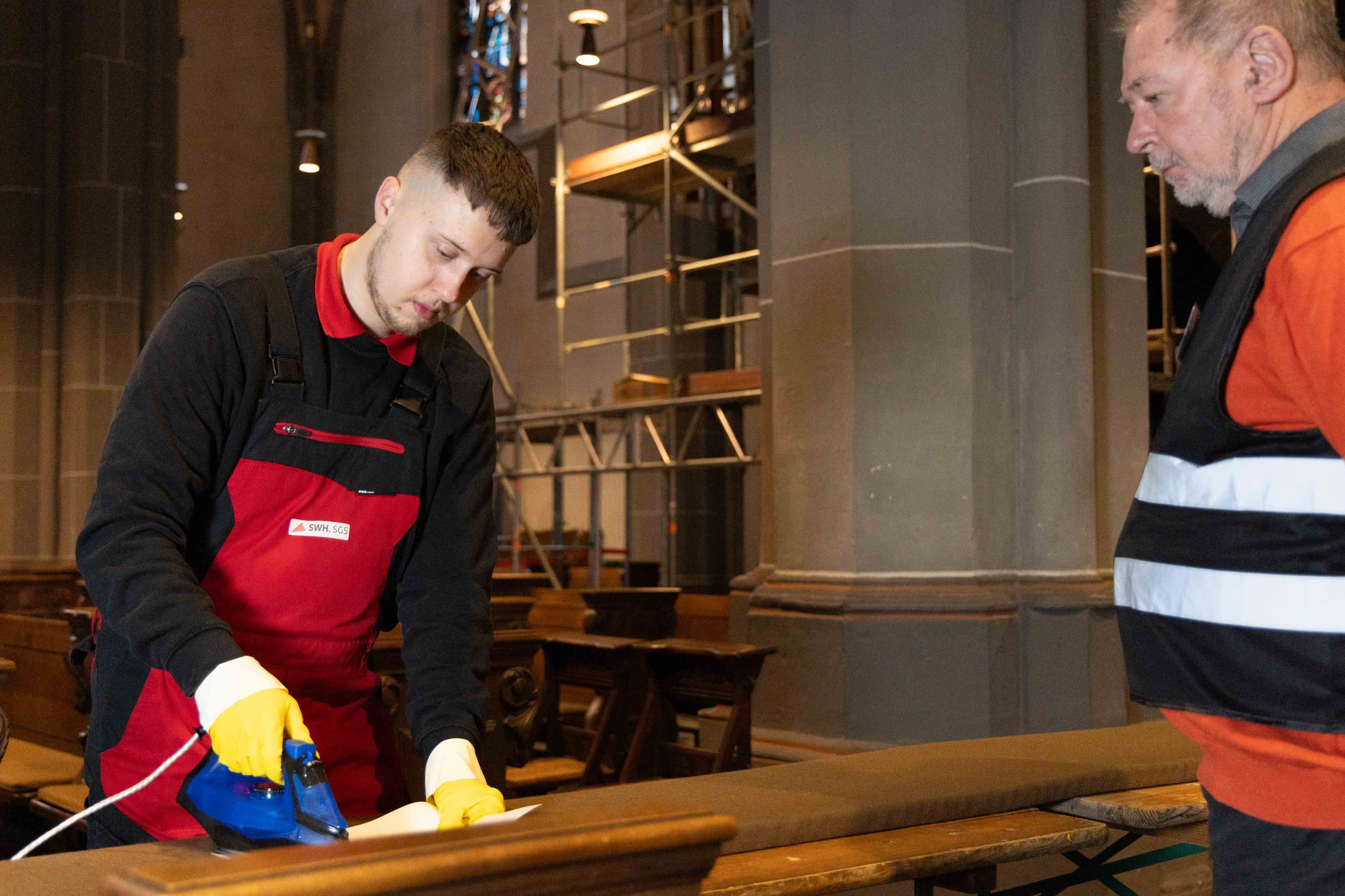 An den beiden Stationen im Inneren der Kirche ging es derweil um die textile Grundreinigung der Sitzpolster für die Kirchenbänke sowie um die Grundreinigung des Natursteinbodens. Bei der Polsterreinigung musste mit einem Sauger zuerst der Grobschmutz entfernt werden. Anschließend wurde vorhandenes Kerzenwachs mit Eisspray, Bügeleisen auf mittlerer Temperatur und Löschpapier und/oder Spachtel beseitigt. Bei der Detachur kamen tensidfreie Fleckenentferner und Sprühextraktionsgeräte mit klarem Wasser zum Einsatz.