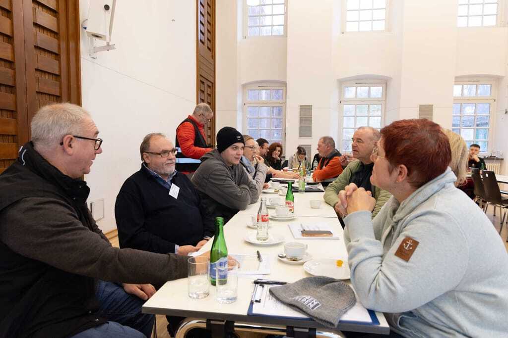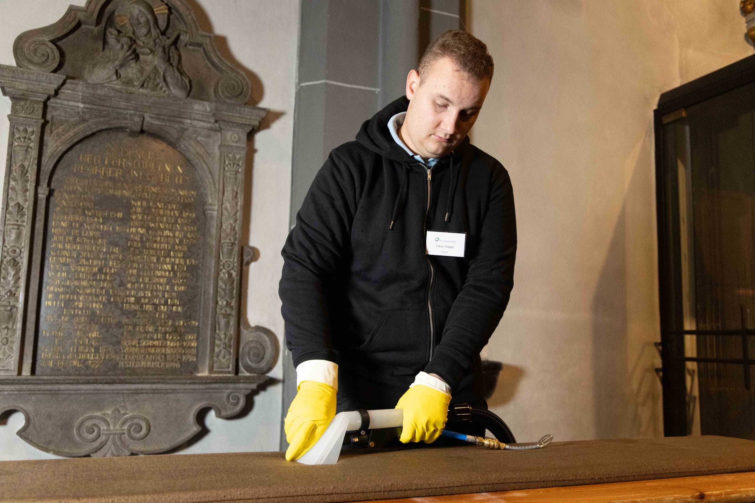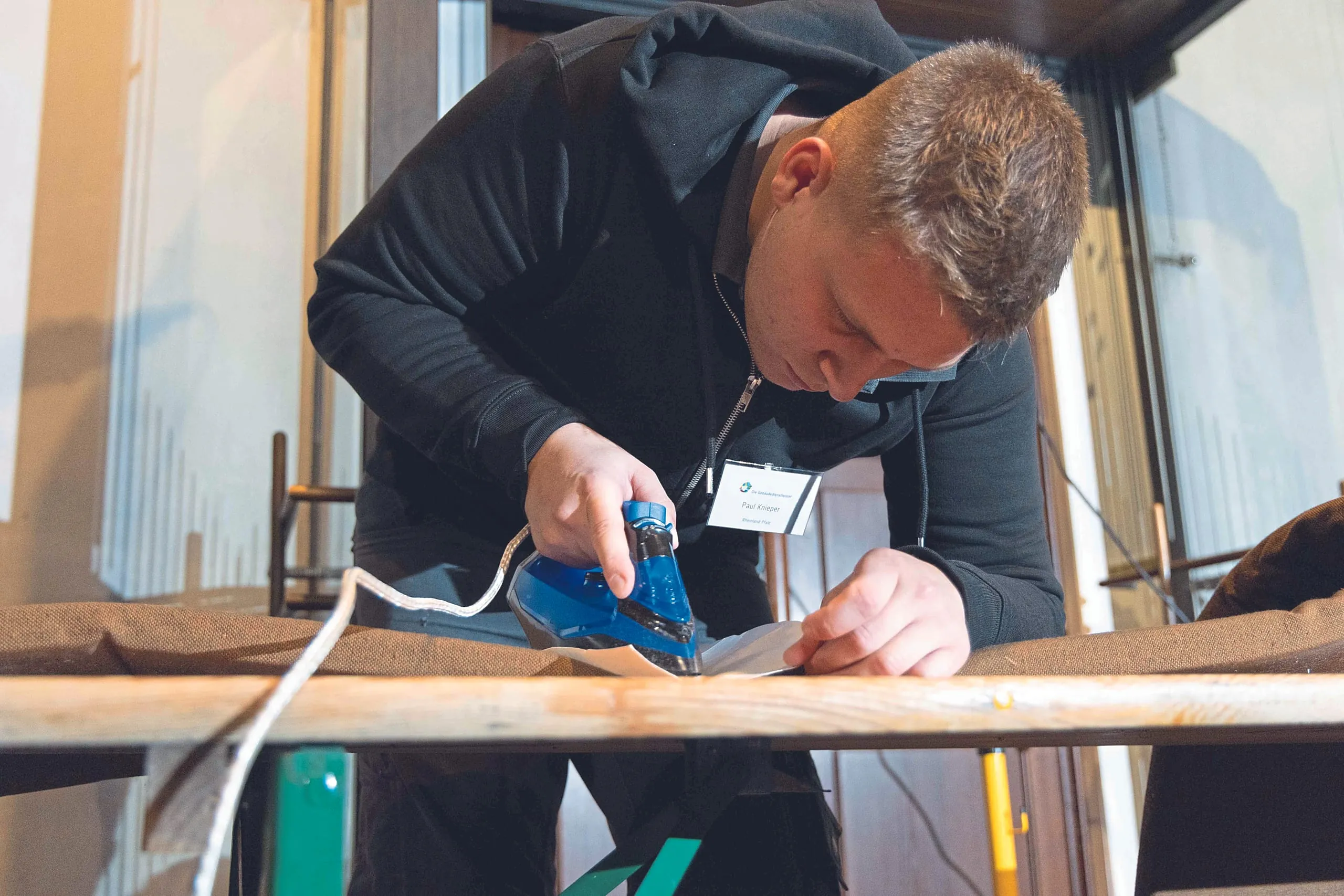 Welche Aufgaben genau auf sie warteten, war den Teilnehmern bis kurz vor dem Wettbewerb nicht bekannt. Dann wurde das Geheimnis gelüftet: Auf dem Programm stand zum einen die Reinigung von historischen Kirchenfenstern im Außenbereich. Zum anderen mussten im Inneren der Kirche Sitzbankpolster und ein Natursteinboden gereinigt werden. Gearbeitet wurde in Kleingruppen an drei Stationen – jeweils zwei Stunden pro Arbeitsprobe, dann ging es an der nächsten Station weiter. Der Jury des Wettbewerbs unter Vorsitz von René Frackowiak – Peter Hollmann und Michaela Peters (Grundreinigung Außenglas), Marion Presek-Haster und Susanne Selbrede (textile Grundreinigung von Polsterbelägen) sowie Dirk Wollenberg, Martin Gleitsmann und Wolfgang Mehl (maschinelle Reinigung eines Natursteinbodens) – entging nichts.