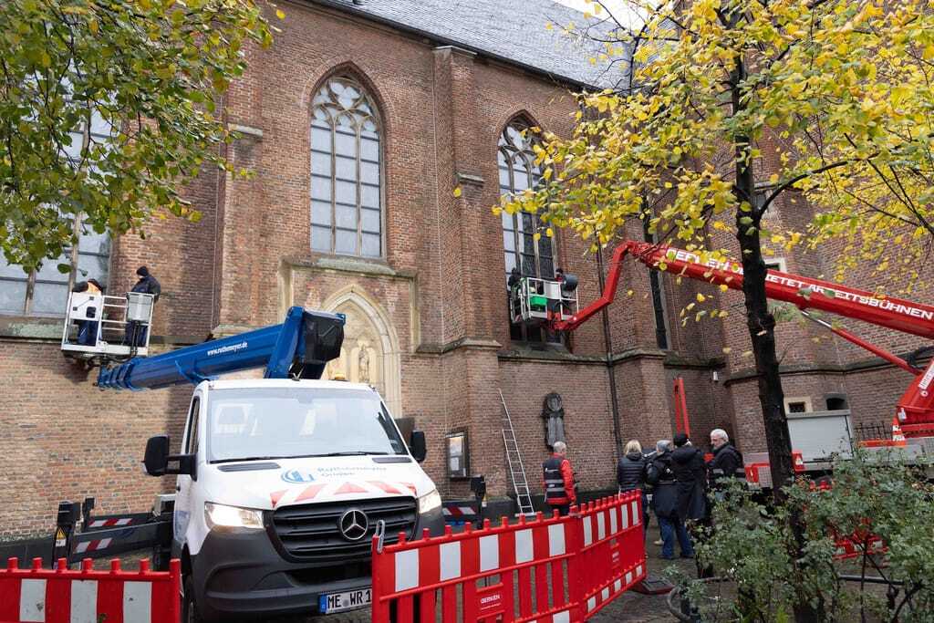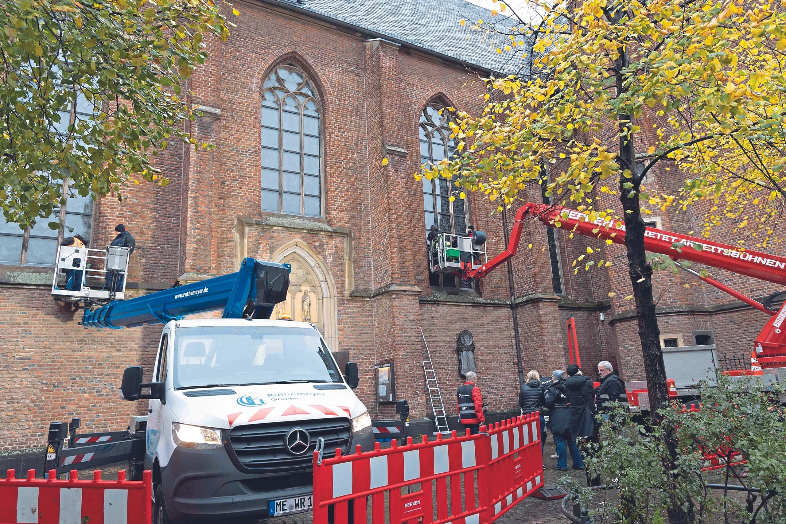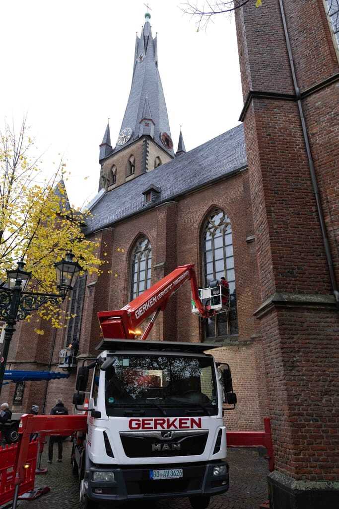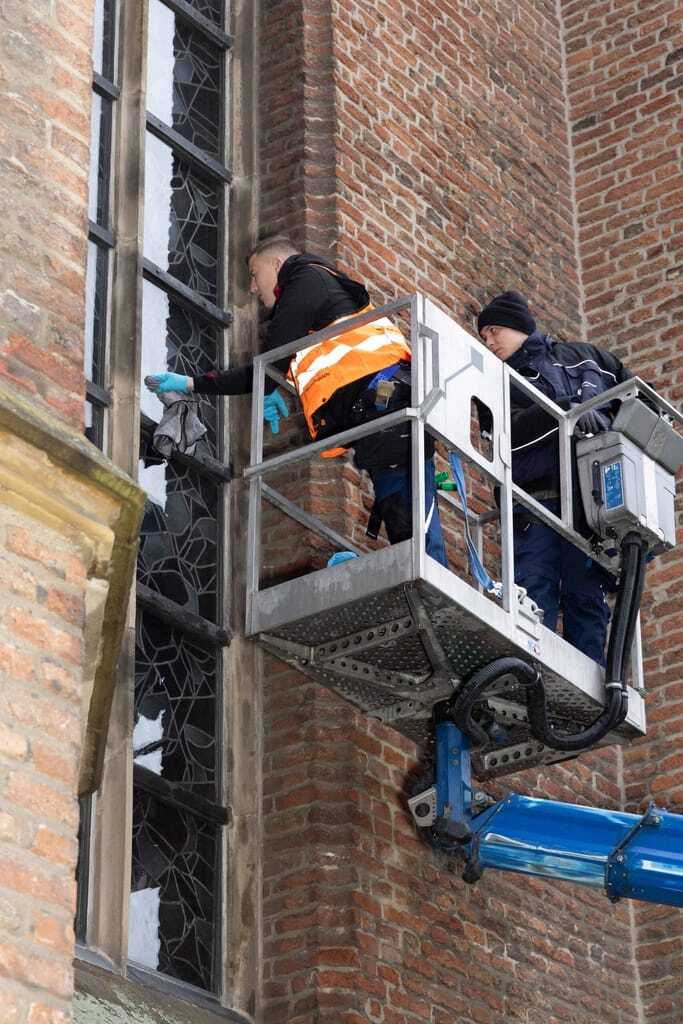 Bei der Glasreinigung im Außenbereich wurde ein Hubsteiger eingesetzt. Die Fenster der Basilika sind alt und wertvoll, weder sie noch der angrenzende Sandstein oder die Bleifassungen durften beschädigt werden. Aufgabe der Wettbewerbsteilnehmer war es, das Schutzglas vor dem eigentlichen Kathedralglas zu reinigen. Zu den Auflagen der Kirche gehörte die chemiefreie Reinigung – und so kamen lediglich Wasser, ein feuchter Schwamm und mineralisches Bimsmehl zum Einsatz.
