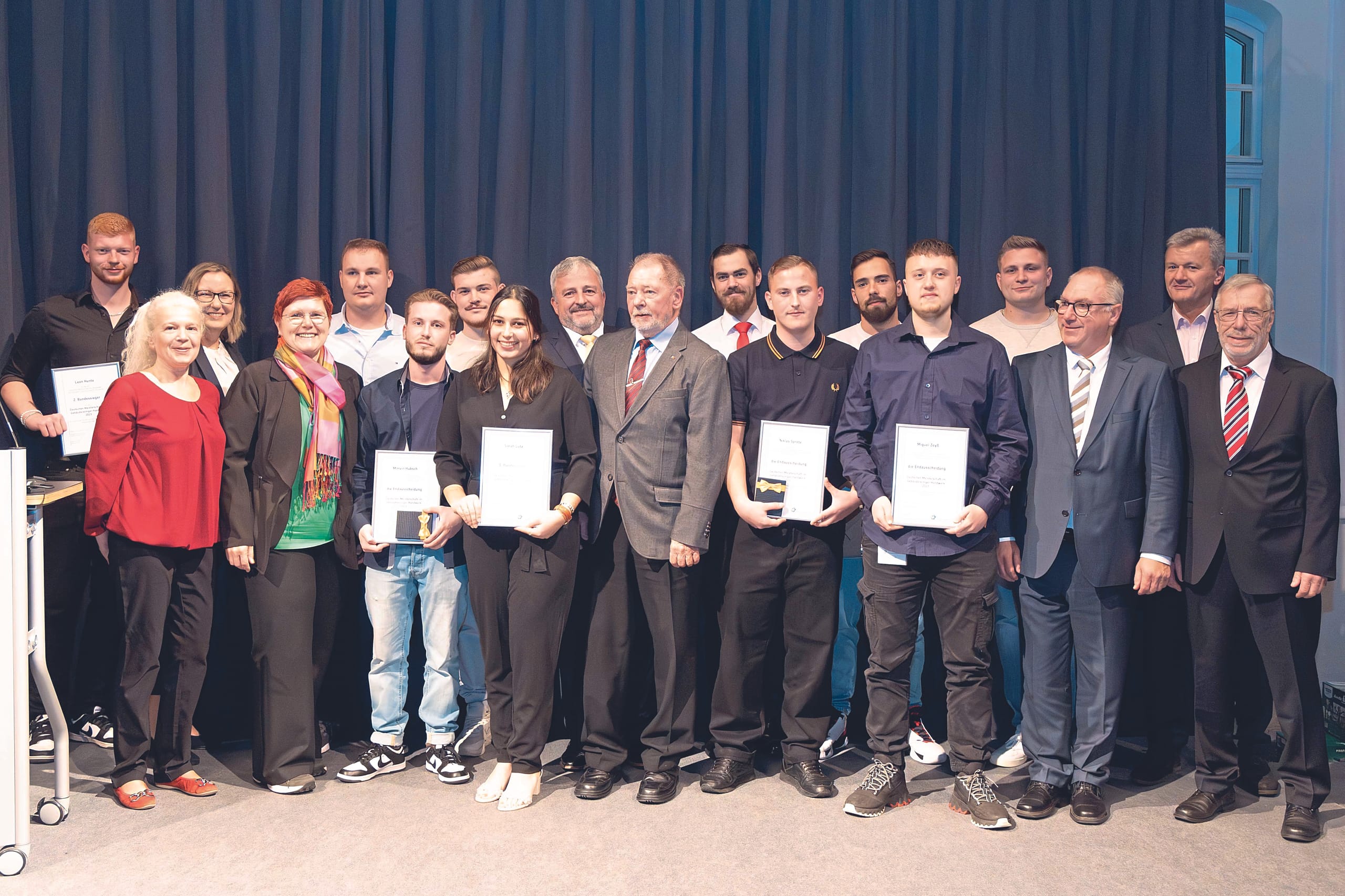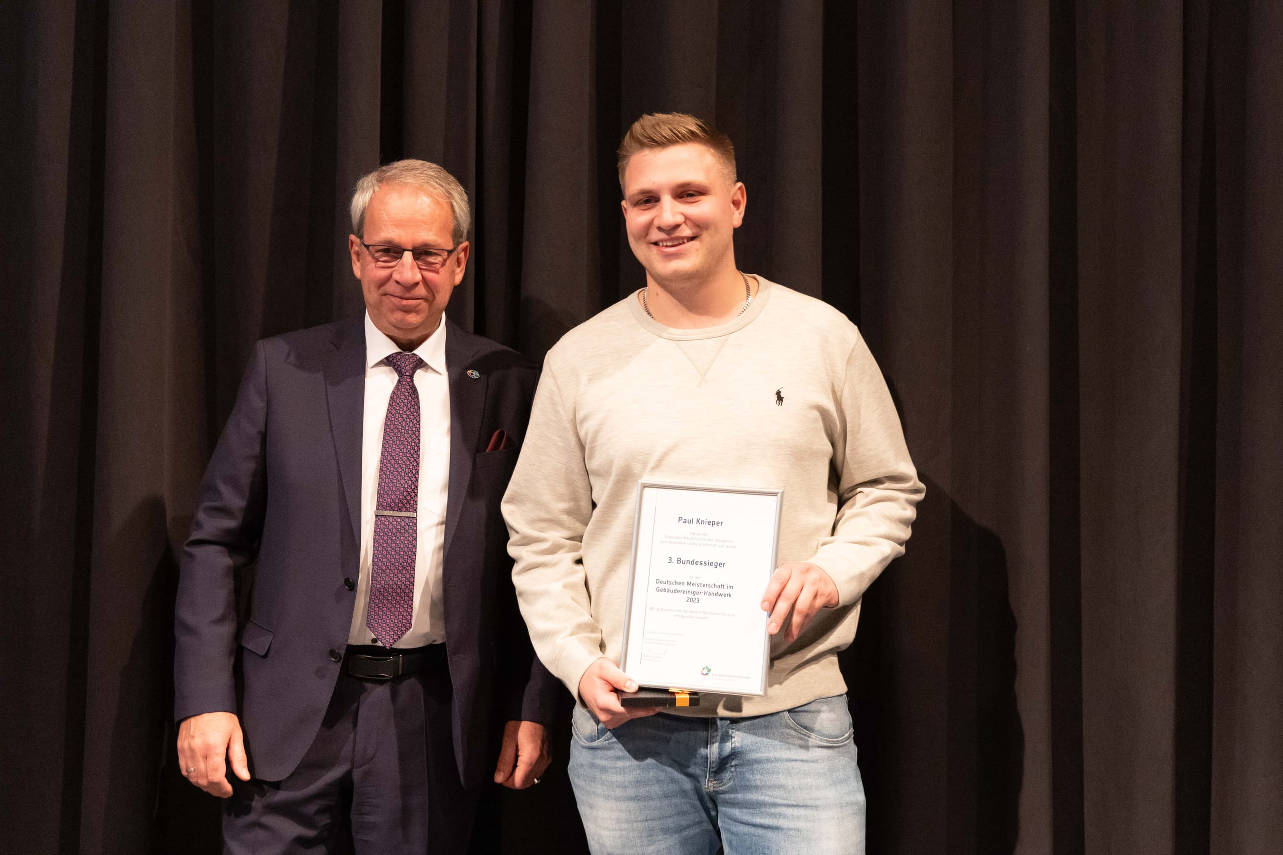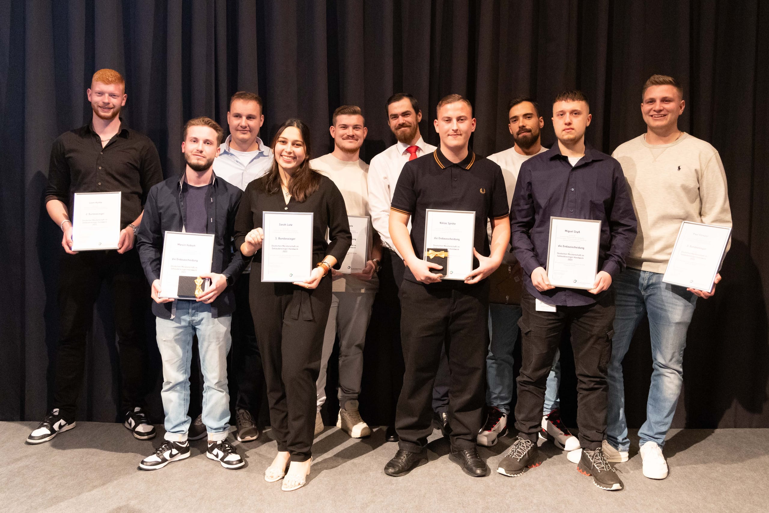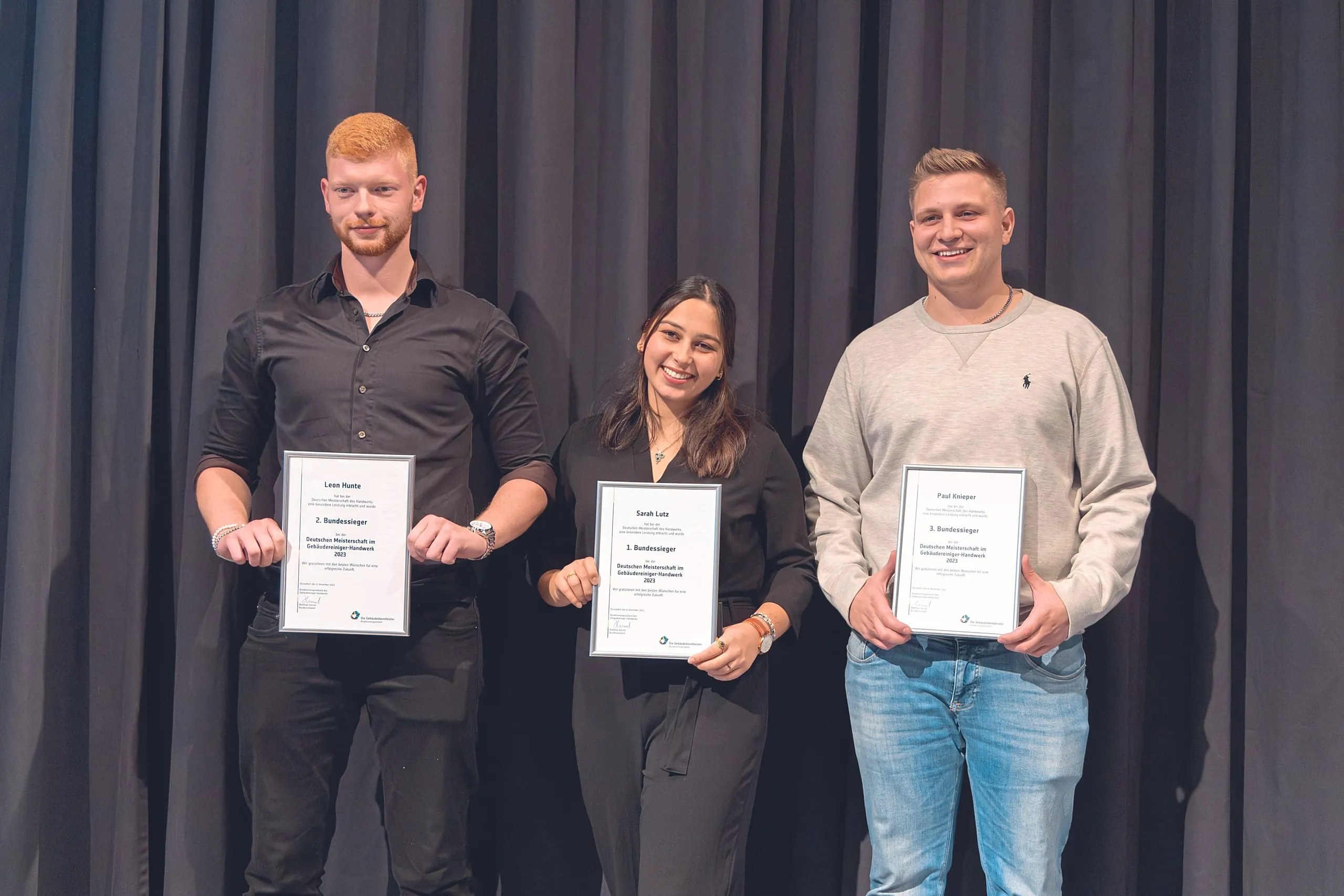 Für das Branchenfinale im Gebäudereiniger-Handwerk 2023 in Düsseldorf hatten sich insgesamt zehn Teilnehmer qualifiziert. Hinter Sarah Lutz als Bundessiegerin gelangte Leon Hunte (Niedersachsen) auf Platz zwei, gefolgt von Paul Knieper (Rheinland-Pfalz) auf Platz drei.