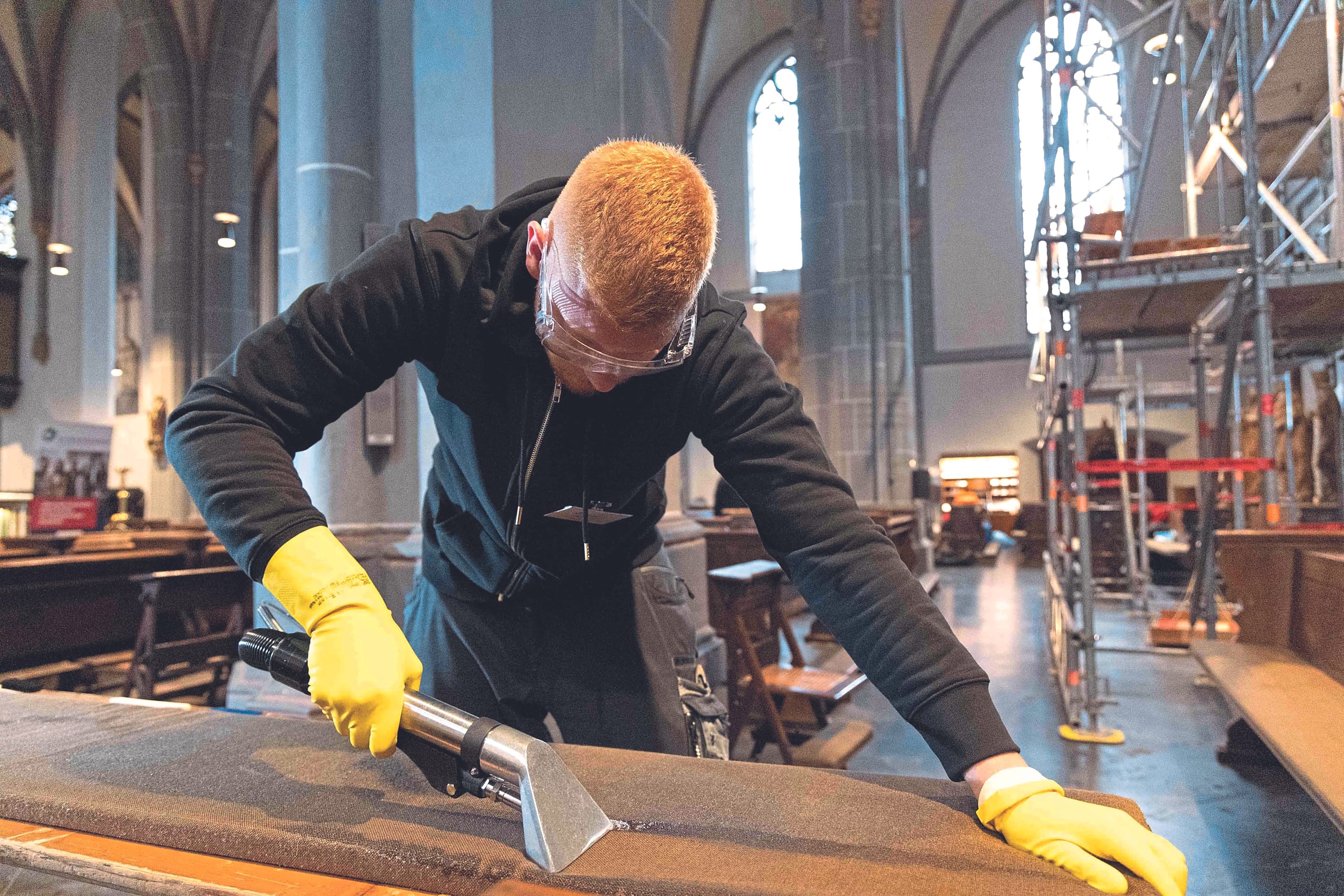 Historische Bleiglasfenster, Sitzbankpolster mit Wachsflecken und ein Natursteinboden, der nur mit Wasser gereinigt werden durfte: Drei nicht ganz alltägliche Herausforderungen waren bei der Deutschen Meisterschaft im Gebäudereiniger-Handwerk 2023 in Düsseldorf zu bewältigen – unter den aufmerksamen Blicken sowohl der Jury als auch zahlreicher Pressevertreter. Mit Sarah Lutz (Baden-Württemberg) setzte sich in der Basilika St. Lambertus am Ende die einzige Gesellin unter den Teilnehmern an der Spitze durch.