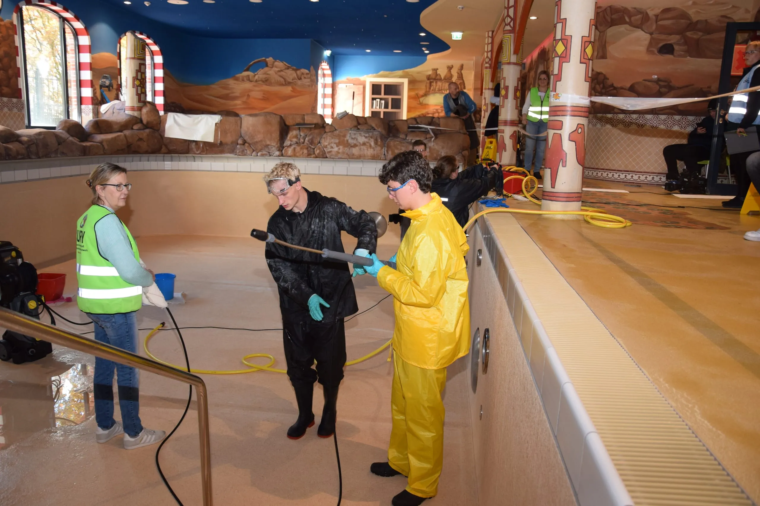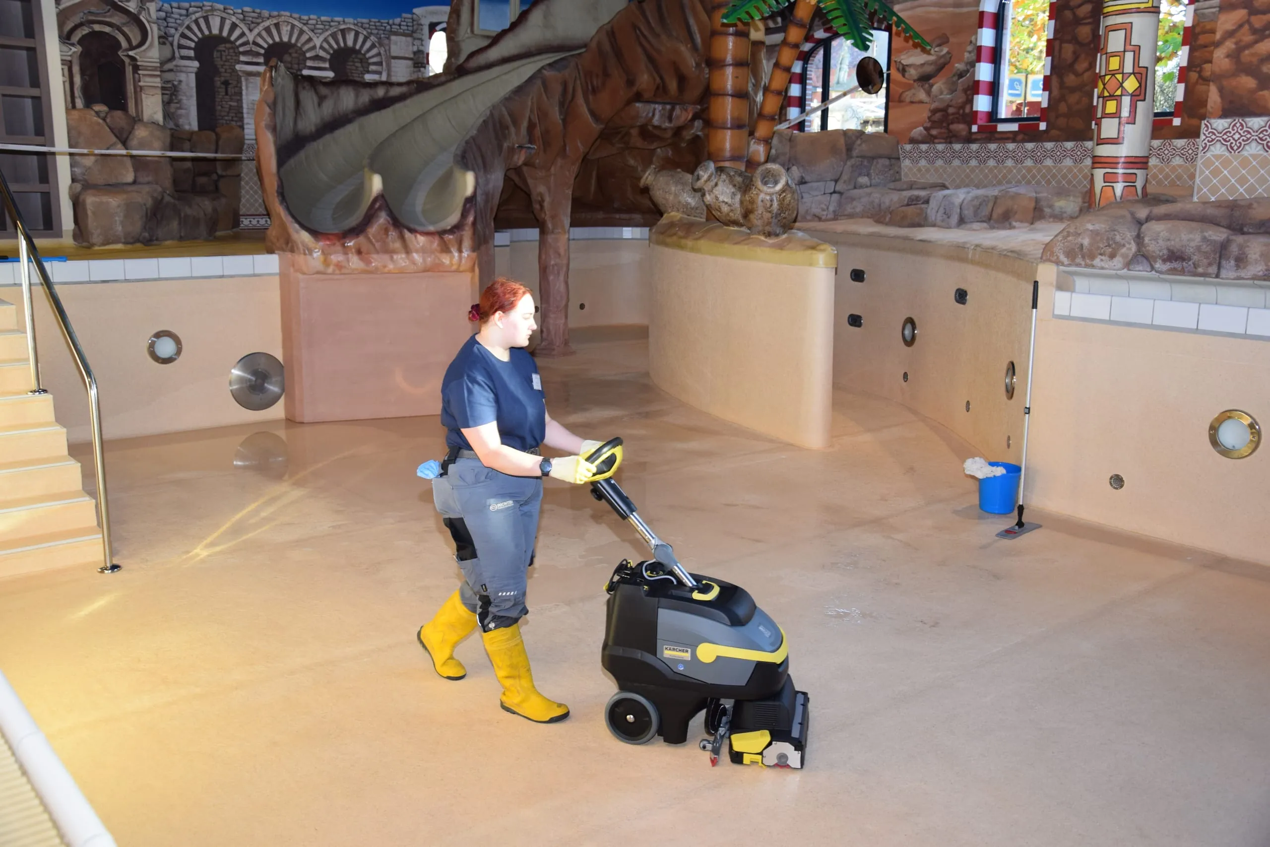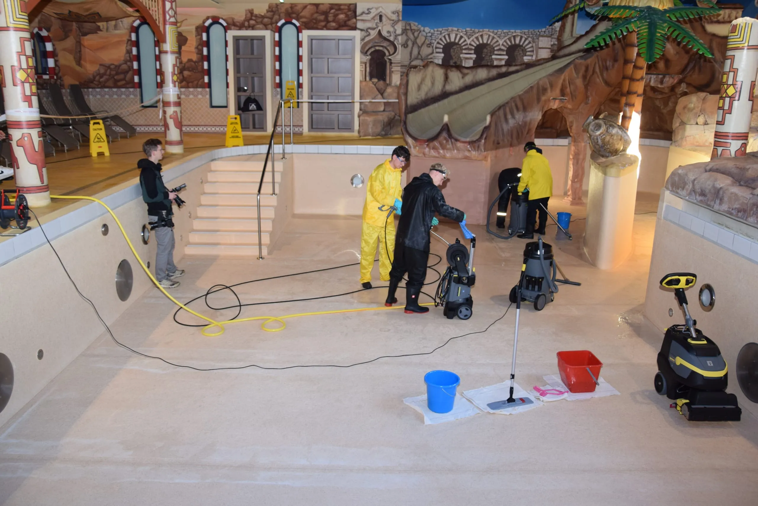 Drei Aufgaben standen im über die Wintermonate für die Öffentlichkeit geschlossenen Freizeitpark auf dem Programm: die Beseitigung von Verschmutzungen an Führungsschienen einer Achterbahn mit Hochdruckreinigern und unter Einsatz von Teleskop-Hebebühnen, die Säuberung von Drachengondeln an einem Karussell und die Reinigung einer Pool-Landschaft mithilfe unterschiedlicher Maschinen und Geräte.