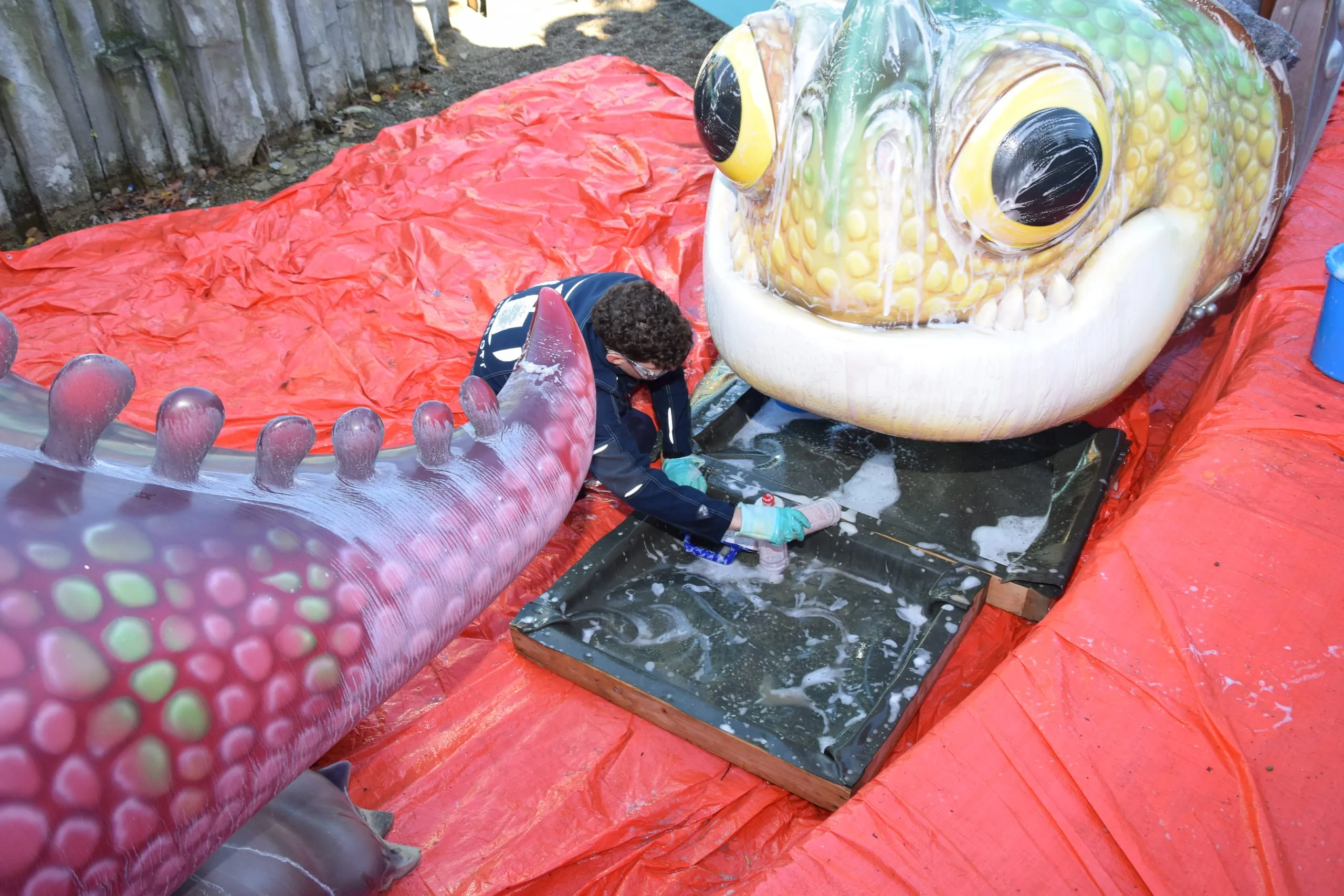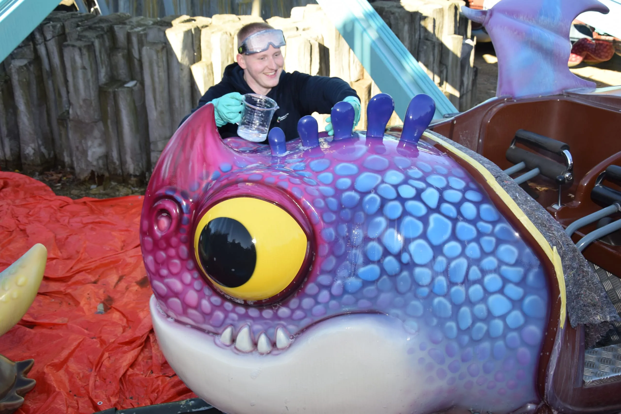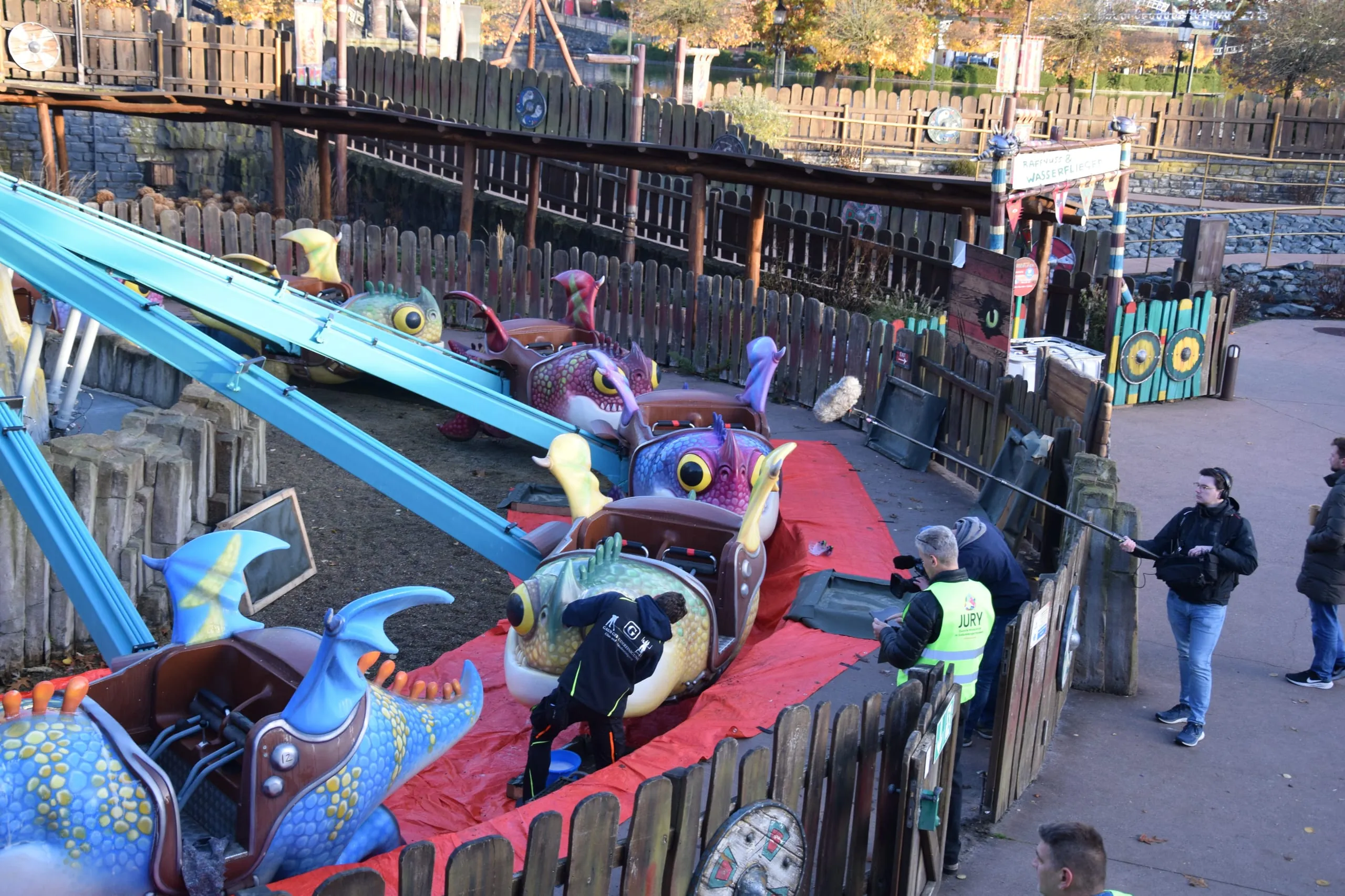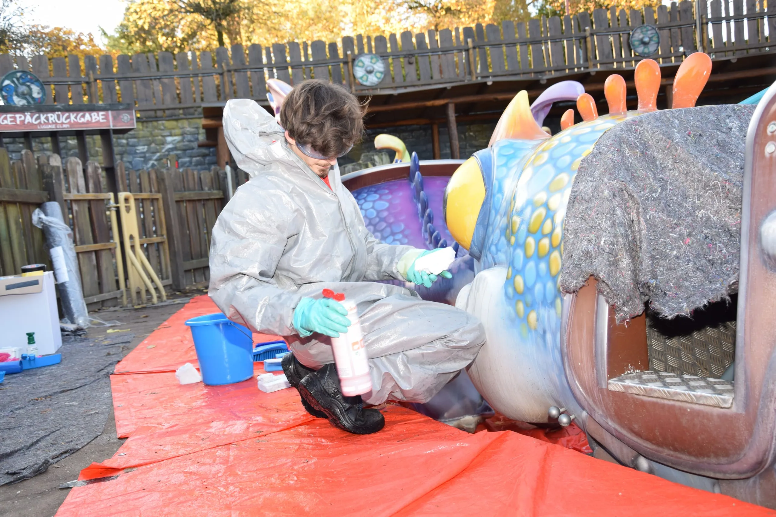 Drei Aufgaben standen im über die Wintermonate für die Öffentlichkeit geschlossenen Freizeitpark auf dem Programm: die Beseitigung von Verschmutzungen an Führungsschienen einer Achterbahn mit Hochdruckreinigern und unter Einsatz von Teleskop-Hebebühnen, die Säuberung von Drachengondeln an einem Karussell und die Reinigung einer Pool-Landschaft mithilfe unterschiedlicher Maschinen und Geräte.