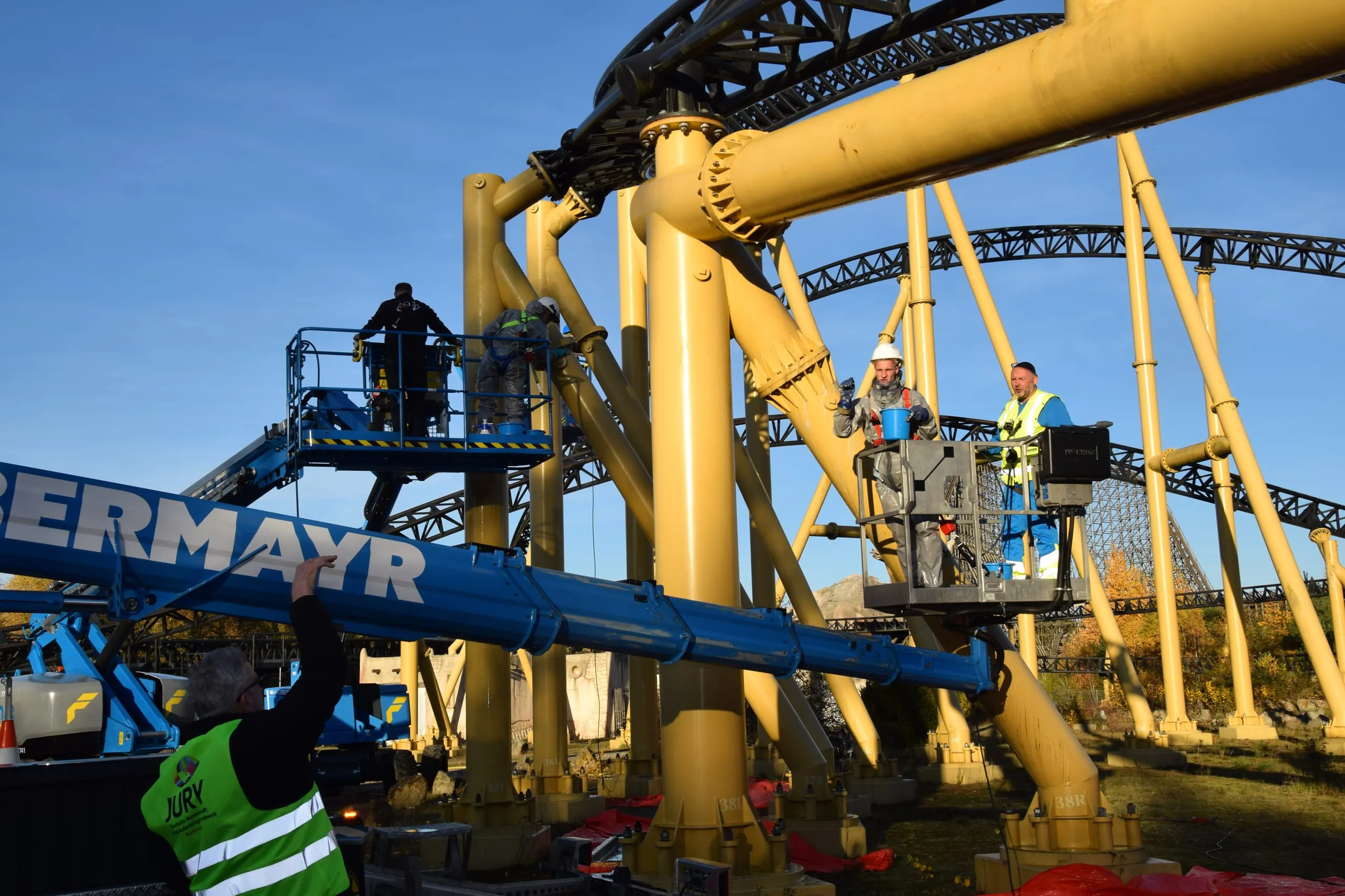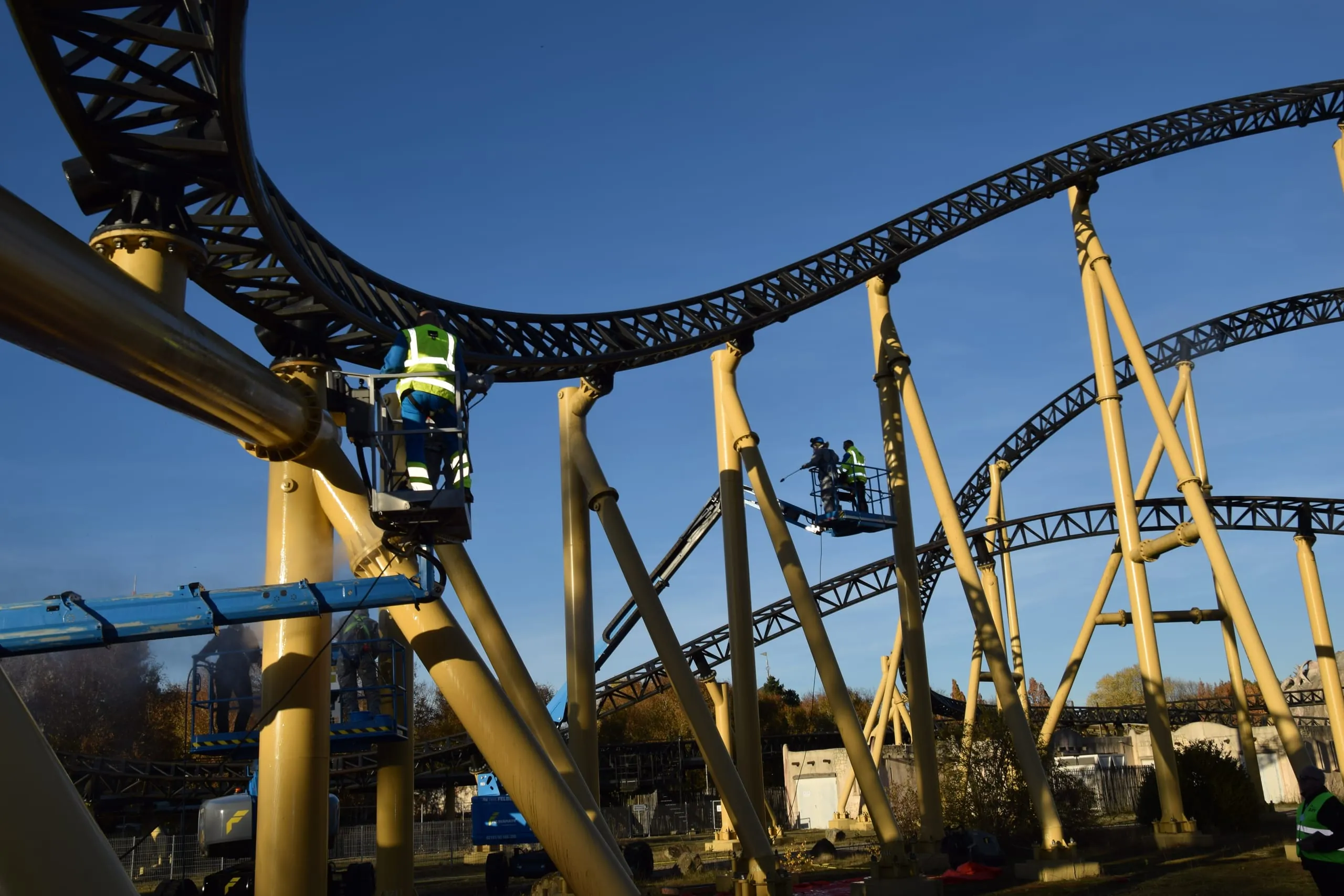 Aufgabe eins war es, Verschmutzungen an Führungsschienen einer Achterbahn zu beseitigen. Gearbeitet wurde mit Hochdruckreinigern von Teleskop-Hebebühnen aus.