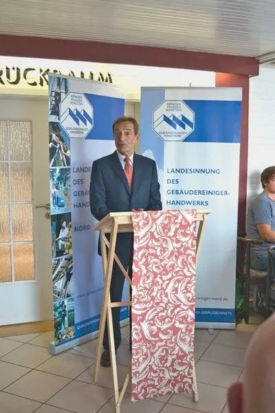 Dieter Kuhnert, Bundesinnungsmeister und Obermeister der Landesinnung Nord, erinnerte in seiner Festansprache an die Entwicklung der vollhandwerklichen Ausbildung im Gebäudereiniger-Handwerk mit einer Ausbildungsdauer von drei Jahren, die anspruchsvollen Tätigkeitsfelder und interessanten und gefragten Gebiete im Bereich des Gebäudereiniger-Handwerks.