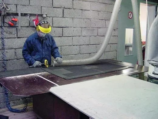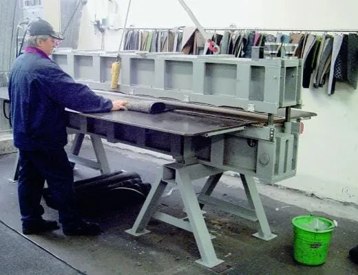 „Für eine Reparatur muss man wissen, woher man den Rohkautschuk bekommt und mit welcher Mischung die jeweiligen Mattenhersteller arbeiten“, sagt Feldmann. Auch die Technik ist wichtig, um eine qualitative Reparatur durchführen zu können. So verfügt Matext Industries über Vulkanisiergeräte, mit denen der Kautschuk mit dem Stoff verschmolzen werden kann. „Haben die Matten Löcher, nehmen wir aus einer alten Matte, die aus dem gleichen Flor besteht und das gleiche Alter hat, ein Stück heraus, setzen es auf der Rückseite ein und vulkanisieren es“, erklärt Feldmann. Auf der Oberfläche ist von der Reparatur nichts zu sehen. Nur auf der Unterseite der Matte kann man erkennen, an welcher Stelle ausgebessert wurde. Die häufigsten Beschädigungen sind Risse am Rand sowie Risse des Gummirückens oder Brandlöcher am Flor. Sind mehr als zwei beschädigte Stellen auf einem Mattenrand, wird der gesamte Rand erneuert. Die zu reparierende Matte sollte aber nicht älter als zehn Jahre sein. Der Vorteil der Reparatur liegt neben dem Kostenfaktor auch in der Wiederverwertung, denn Kautschuk ist schwierig zu entsorgen. Dadurch, dass er mit Flor vulkanisiert wurde, muss er als Sondermüll auf bestimmte Verwertungsanlagen gebracht werden.
