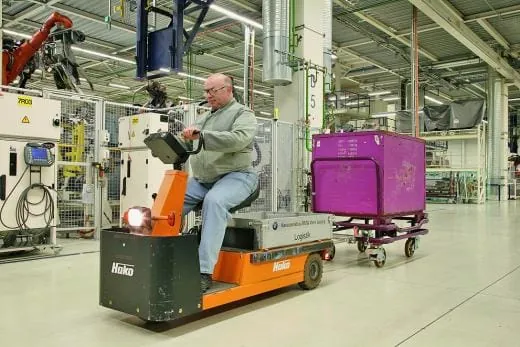 Die Reinigungskräfte nutzen außerdem einen Elektrotransporter mit Industrieanhänger. Damit fahren sie zum Beispiel Depots an, die auf dem gesamten Gelände verteilt sind, um etwa die Sanitärräume mit Seife, Toilettenpapier und sonstigen Verbrauchsmaterialien auszustatten. Aber auch bei BMW selbst kommen in der Abteilung Wartung und Instandhaltung 15 der Elektroschlepper zum Einsatz und sorgen für den schnellen Materialtransport.