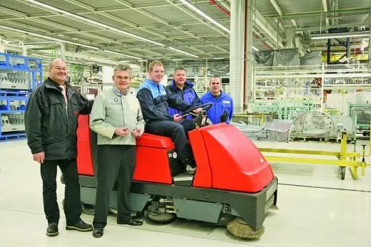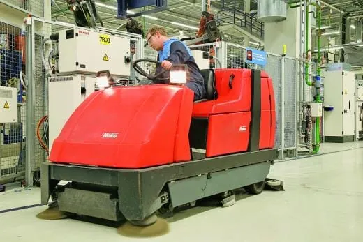 Im Karosseriebau und der Montage kommen die zwei Scheuersaugmaschinen mit Kehrvorsatz zum Einsatz. Die Hectas-Mitarbeiter fahren regelmäßig die etwa 3 m breiten Verkehrswege und Bereitstellungsflächen mit den Nassschrubbautomaten ab. Trotz leistungsstarker Absauganlagen fällt hier Schweißstaub an, der gründlich beseitigt werden muss. Die Reinigungsmaschinen sollten daher wendig sein und über langlebige Batterien und große Tanks verfügen, damit die Mitarbeiter die Automaten über entsprechend lange Zeiträume einsetzen können und nur geringe Rüstzeiten einplanen müssen, so die Anforderungen des Dienstleisters.