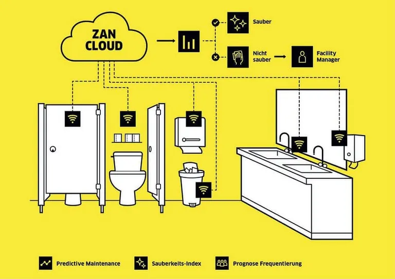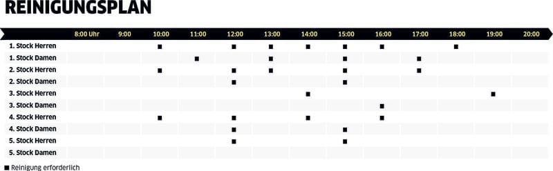 Werden jedoch die Frequentierung von Räumlichkeiten sowie der Stand der zur Verfügung gestellten Verbrauchsmaterialien über Sensoren erfasst, so kann aus diesen Daten eine dynamische, bedarfsorientierte Steuerung der Reinigung erfolgen.