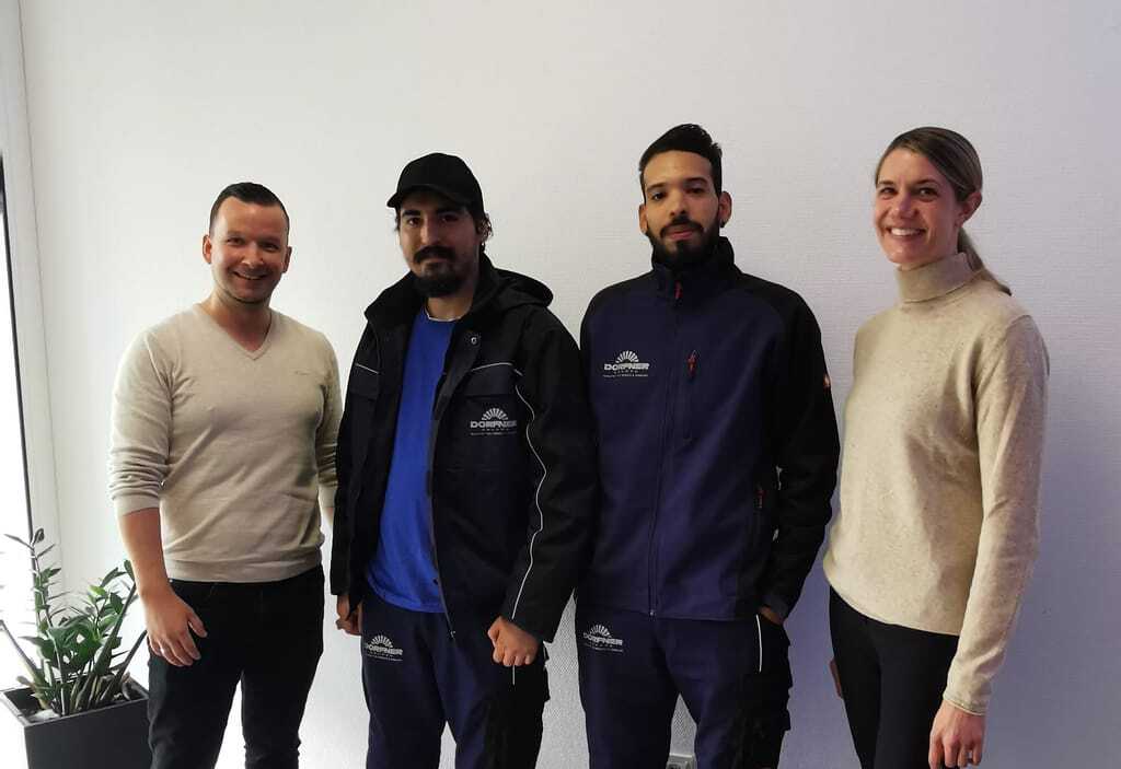 Daniela Karl, Ausbildungsleiterin bei Dorfner, und Ausbilder Christian Zschau (li.) zusammen mit den beiden Azubis Zouhair Barqloune (2.v.li.) und Mohammed Naji. - © Dorfner