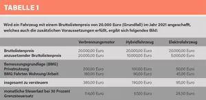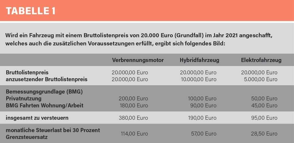 Wird ein Fahrzeug mit einem Bruttolistenpreis von 20.000 Euro (Grundfall) im Jahr 2021 angeschafft, welches auch die zusätzlichen Voraussetzungen erfüllt ergibt sich eine monatliche Steuerlast von 114 Euro bei einem Verbrennungsmotor, 57 Euro bei einem Hybridfahrzeug und 28,50 bei einem Elektrofahrzeug (siehe Tabelle 1 ).