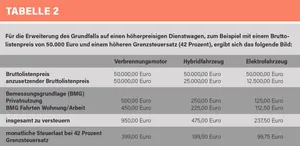 Für die Erweiterung des Grundfalls auf einen höherpreisigen Dienstwagen, zum Beispiel mit einem Bruttolistenpreis von 50.000 Euro und einem höheren Grenzsteuersatz (42 Prozent), ergibt sich das folgende Bild: Die monatliche Steuerlast beträgt bei einem Verbrennungsmotor 399 Euro. Bei einem Hybridfahrzeug sind es 199,50 Euro und bei einem Elektrofahrzeug 99,75 Euro (siehe Tabelle 2 ). Das Beispiel zeigt, dass zum Beispiel bei der Wahl eines Elektrofahrzeugs anstatt eines Verbrenners erhebliche Steuereinsparungen möglich sind: Beim preiswerteren Fahrzeug in Höhe von 1.026 Euro jährlich, beim teureren Fahrzeug sind es 3.591 Euro. Es sei nochmals betont, dass es sich um Nettobeträge handelt, die dem Betroffenen im Portemonnaie verbleiben. Aus Unternehmersichtsind die Kosten der Anschaffung beziehungsweise der damit verbundene steuerliche Vorteil aus dem Abschreibungspotenzial gleich.
