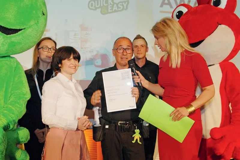 In der Kategorie Ausrüstung und Geräte kam das Schaumsprühkopfsystem Quick & Easy von Werner & Mertz auf Platz eins. Ausschlaggebend für die Jury waren die Einfachheit und Funktionalität des mobilen Dosiersystems, das sich an einem speziellen Gürtel befestigen lässt. Das System arbeitet mit zwei Kartuschen. Die eine Kartusche wird mit Wasser befüllt, die andere mit einem von fünf zur Verfügung stehenden Reinigungsmitteln. Das Konzentrat wird automatisch in der benötigten Menge verdünnt. Die Reinigungskraft kann die Mittel schnell und einfach wechseln, ohne dass sie mit ihnen in direkten Kontakt kommt.