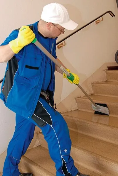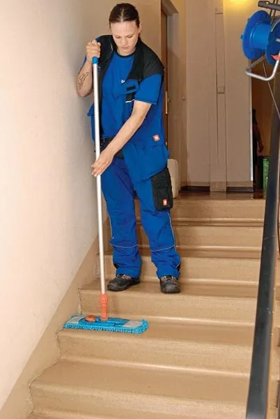 Das Reinigungsteam der HVSG besteht aus 14 Mitarbeitern. Diese sind zuständig für die Reinigung von circa 70 Wohngebäuden, in denen rund 180 Aufgänge und die Treppenhäuser zu reinigen sind. Zusätzlich übernehmen die Reiniger auf Wunsch der Mieter (rund 5.000) auch die Unterhalts- und Glasreinigung in den Wohnungen, dies macht aber nur fünf Prozent des Reinigungsvolumens aus. Die Treppenhäuser werden einmal die Woche gereinigt. Einmal pro Jahr steht zusätzlich eine Grundreinigung an. In den vielen Aufgängen und Treppenhäusern ist eine ganze Palette an elastischen Bodenbelägen verlegt wie PVC, Linoleum, Gumminoppen, Kautschuk, partiell kommen auch Steinböden vor.
