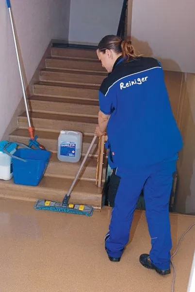 Der wesentliche Vorteil des Grundreinigers ist die Tatsache, dass kein Neutralisieren, kein Nachspülen und keine Trockenzeiten notwendig sind. Das spart viel Zeit – in Anbetracht der fast 70 zu reinigenden Gebäude ein entscheidender Vorteil. Der Grundreiniger löst hartnäckige, tiefporige Verschmutzungen unmittelbar nach dem Aufsprühen der gebrauchsfertigen Lösung (50 Milliliter pro Quadratmeter) und ist zur schnellen Grundreinigung von PVC-, Linoleum-, Gummibelägen, Kunst- und Naturstein sowie Parkett (Holzböden, geölt oder gewachst) geeignet. Besonders gut eignet sich das Produkt aufgrund seiner Eigenschaften eben auch zur Grundreinigung von Treppenhäusern.