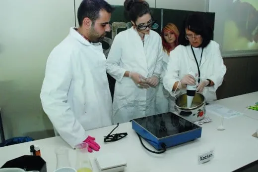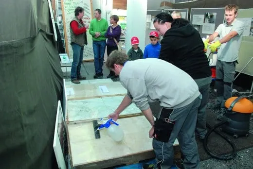 Beim Tag der offenen Tür in Schulgebäude und Werkstätten präsentierten sich auch die Gebäudereiniger in voller Aktion. Die Palette reichte vom Seifenworkshop über Steinkristallisation zum Mitmachen bis zur „Dust-Rallye“ mit der Kehrmaschine. Unter dem Titel „Saubere Filme“ waren Videos zum Thema Reinigung zu sehen, die im Unterricht entstanden sind. Was es damit auf sich hat, zeigten Schüler in der Videowerkstatt: Besucher konnten sich mit einer Einscheibenmaschine vertraut machen, deren Funktionen anschließend vor der Kamera erklären - und das Ergebnis als Kurzfilm auf CD als Erinnerung gleich mitnehmen. Der Lerneffekt: Was man sich so aneignet, dass man es für andere verständlich wiedergeben kann, bleibt länger im Gedächtnis haften als Stoff, der nur für eine Prüfung auswendig gelernt wird.