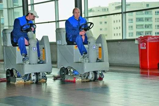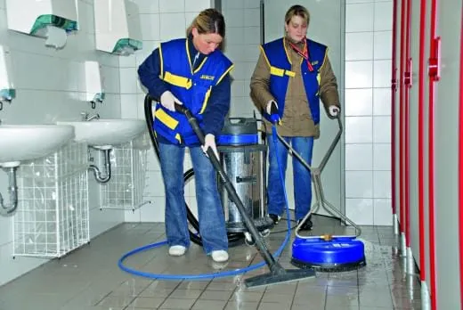 03 Schnelles „Doppelpass-Spiel“ in den Sanitärräumen: Die Bodenfliesen im Sanitärbereich werden mit dem PowerScrub P400 von Nilfisk-Alto gereinigt und anschließend trocken gesaugt.