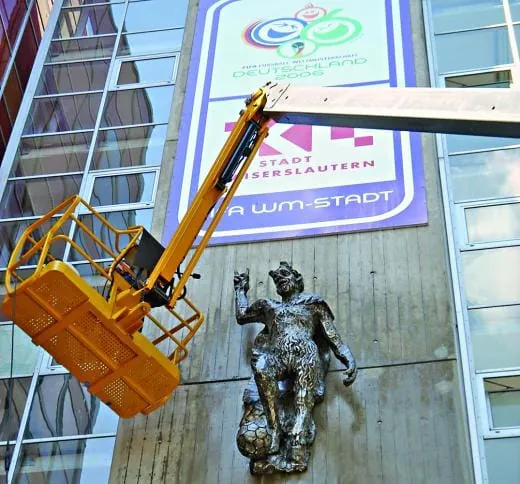 01 Ab und an braucht sogar der Teufel eine Komplettreinigung. Das über dem Stadioneingang befestigte Wahrzeichen des 1. FCK wird mit Hilfe einer Arbeitsbühne auf Hochglanz gebracht.