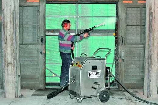 Den Auftrag zum Säubern der Außenfassaden des Speichers hat Buck nach einer Ausschreibung an den Dienstleister Raabe aus dem schleswig-holsteinischen Barsbüttel vergeben, der in Hamburg eine Niederlassung betreibt. Der Spezialist für Fassadenreinigungen, der auch Farb-, Graffiti- und Schimmelpilzentfernungen, Industriereinigungen, Abbeizarbeiten, Graffitischutzsysteme und Brandschadensanierungen anbietet, kann Erfahrungen mit dem Trockeneisstrahlen vorweisen. Er setzt das Trockeneisstrahlgerät von Kärcher in Innen- und Außenbereichen ein. In diesem Fall besteht Raabes Aufgabe darin, die straßen- und die fleetseitige Fassade des Speichers zu säubern und hierbei ihre Patina zu erhalten.