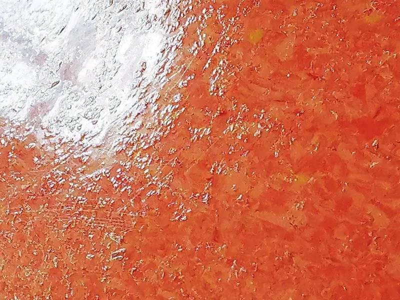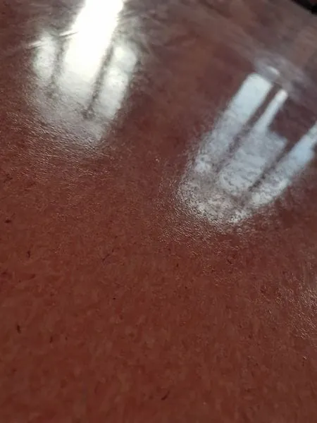 Durch den Auftrag eines neuen Pflegefilmes wurden die alten Rückstände in die Oberfläche eingebunden, so dass – wie auf den Bildern zu sehen – eine pockenartige oder einer Orangenhaut ähnliche Oberfläche entstand. Das Fazit des Sachverständigen lautete deshalb: Eine erneute Grundreinigung mit anschließender Beschichtung ist unumgänglich.