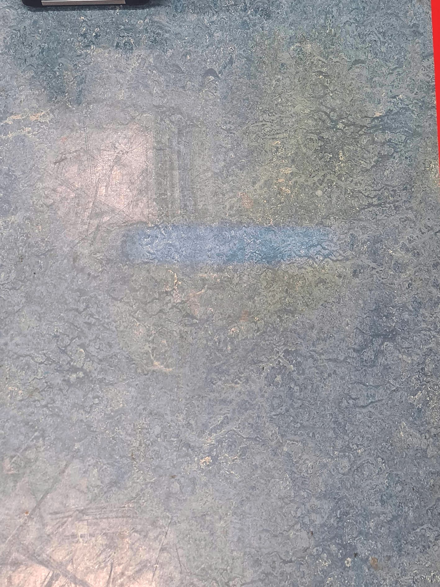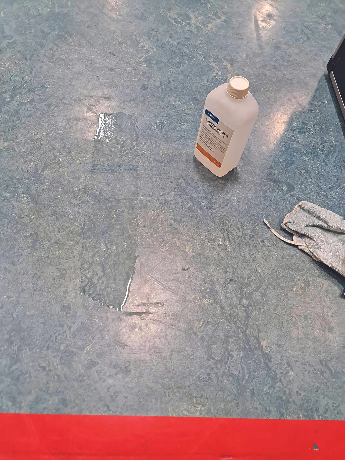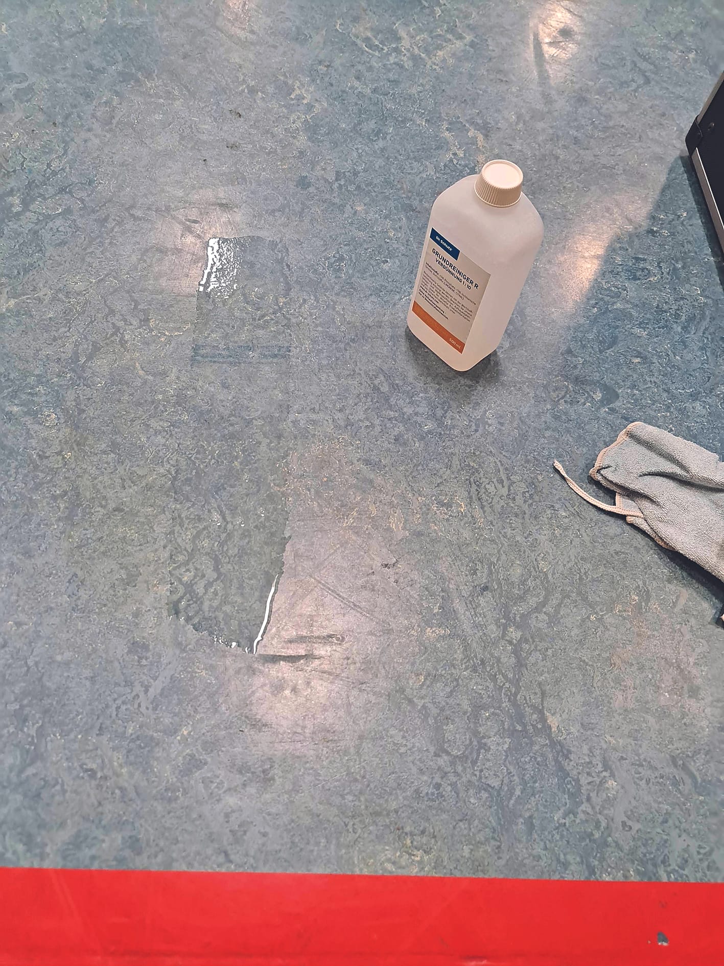 Bei der Auswahl des Reinigungsmittels spielte in die Karten, dass der Linoleumboden vor längerer Zeit (es standen etwa zehn Jahre im Raum) mit einem Polyurethan-Lack als Oberflächenschutz versehen worden war. Allerdings war davon auszugehen, dass nur noch geringe Reste des PU-Lacks vorhanden waren, da seitens des Objektbetreibers über Jahre hinweg regelmäßig klassische Nassgrundreinigungen in Auftrag gegeben und auch durchgeführt worden waren. Beim Ortstermin konnte kein Haftungsproblem festgestellt werden.